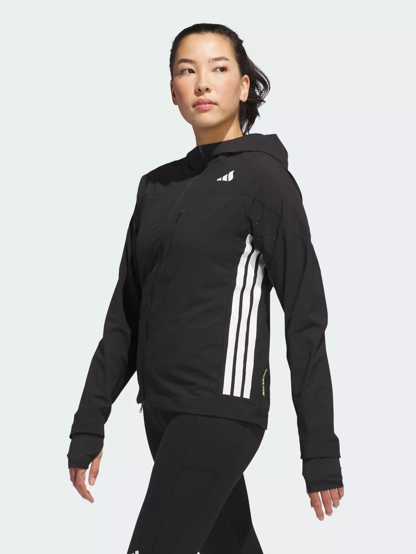 Zip up and keep training in cooler weather. With a slim, aerodynamic fit, built-in vents and wind resistance, this adidas running jacket is ready to help you make breakthroughs in your running. You can customise the fit with adjustable bungees at the hood and hem.This product is made with 100% recycled materials. By reusing materials that have already been created, adidas help to reduce waste and our reliance on finite resources and reduce the footprint of the products adidas make.- Slim fit