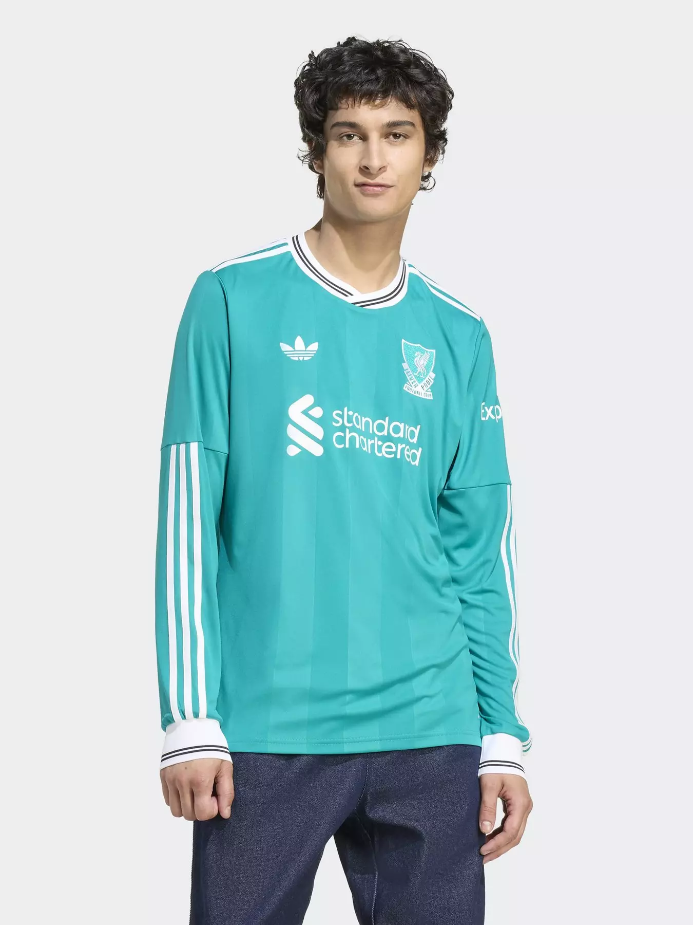 A modern football classic inspired by Liverpool FCs storied 3-Stripes history. The tonal vertical stripes on this third jersey come in unmistakable adidas Equipment green. On the chest, that vintage club badge shares the spotlight with a Trefoil for the first time since 1991. Created for travelling Reds, this long sleeve shirt includes moisture-managing AEROREADY so it feels as good as it looks.- Material Content: 100% PET-REC