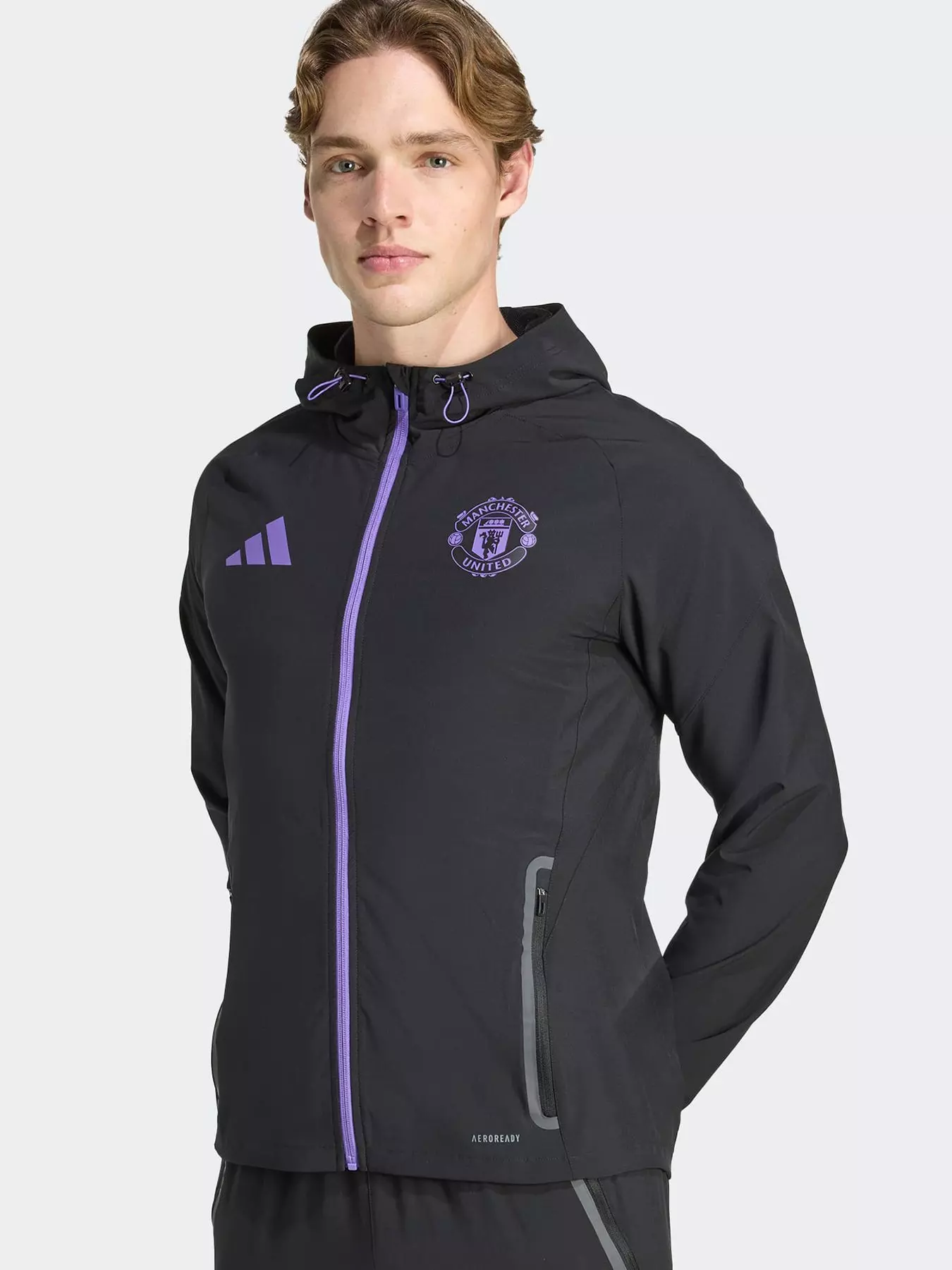 - However far you go, this adidas Manchester United jacket will keep you comfortable every step of the way. Combining technical detailing, soft, stretchy fabric and moisture-managing AEROREADY, it ensures you look and feel the part every time you leave your front door.