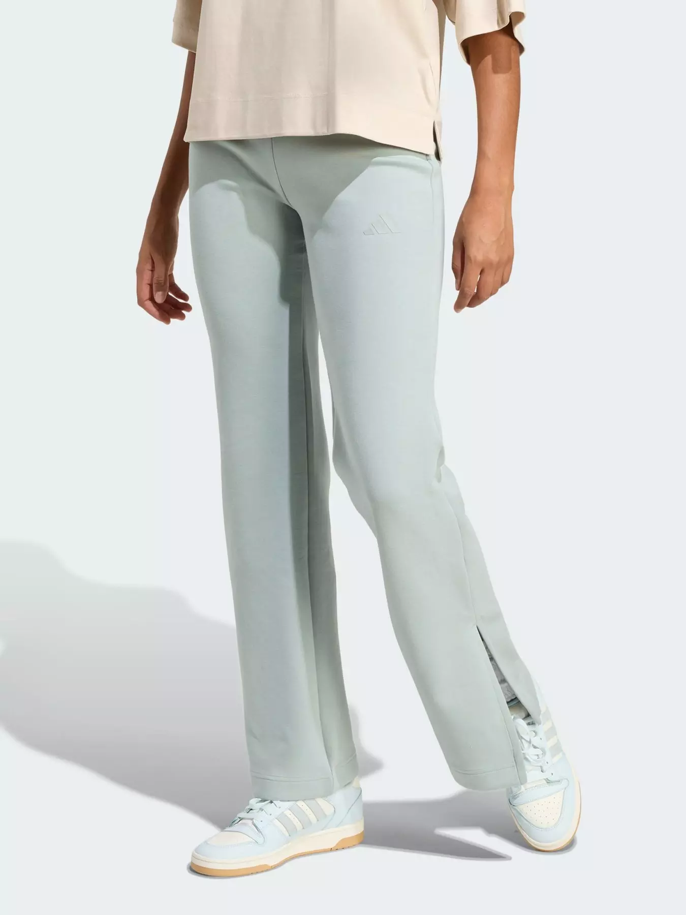 These flared adidas pants are your go-to for laid-back luxury. The soft, peached fabric keeps you comfortable as you move from place to place, while the slim fit, mid-rise waist and flared hems create a flattering silhouette. Inner elastic provides the perfect fit and side slits add a stylish touch.- Slim fit