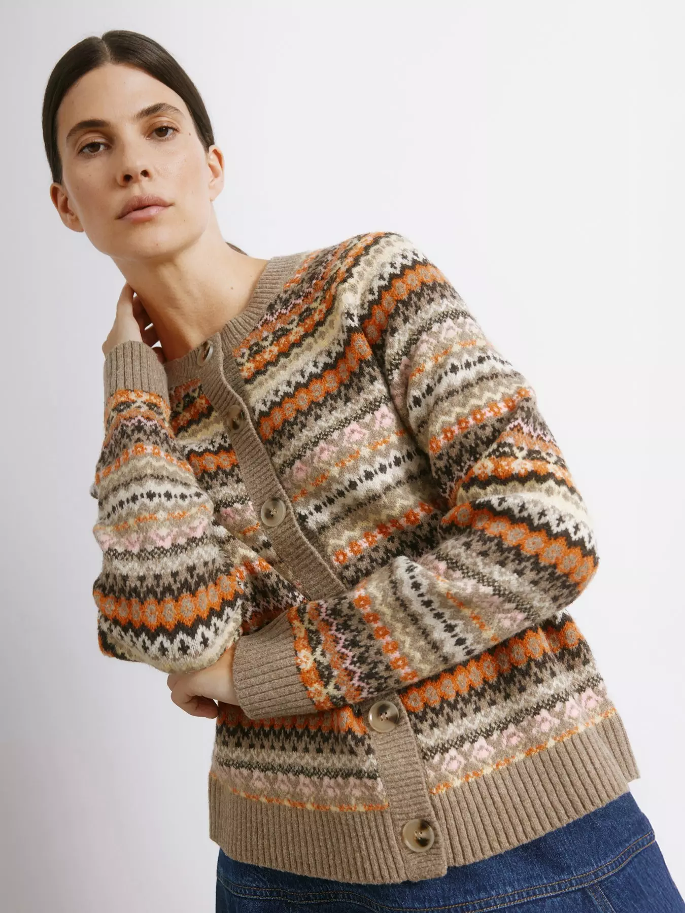 This Neutral Fair Isle Cardigan offers a cosy blend of comfort and classic style, crafted in a soft wool blend. Its subtle shades and neutral tones make it a versatile addition to any wardrobe, easily pairing with a variety of outfits. The horn effect buttons add a touch of timeless detail, enhancing its traditional charm. Perfect for layering, this cardigan provides warmth making it an excellent choice for cooler days when you want to stay comfortable and stylish.- Material Content: 50% Recycled Polyester 37% Polyester 10% Wool 3% Elastane