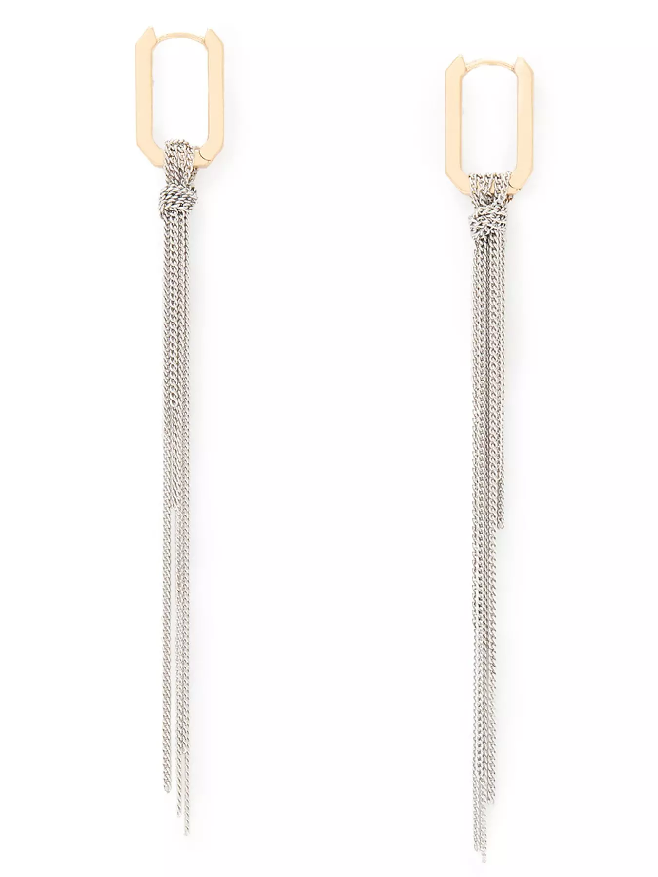 Minimal hexagon hoop earrings paired with dangling contrasting refined chain fringe for a playful statement. Earrings have a hinge closure. Made from brass.- Material Content: EARRINGS 99% BRASS 1% CZ