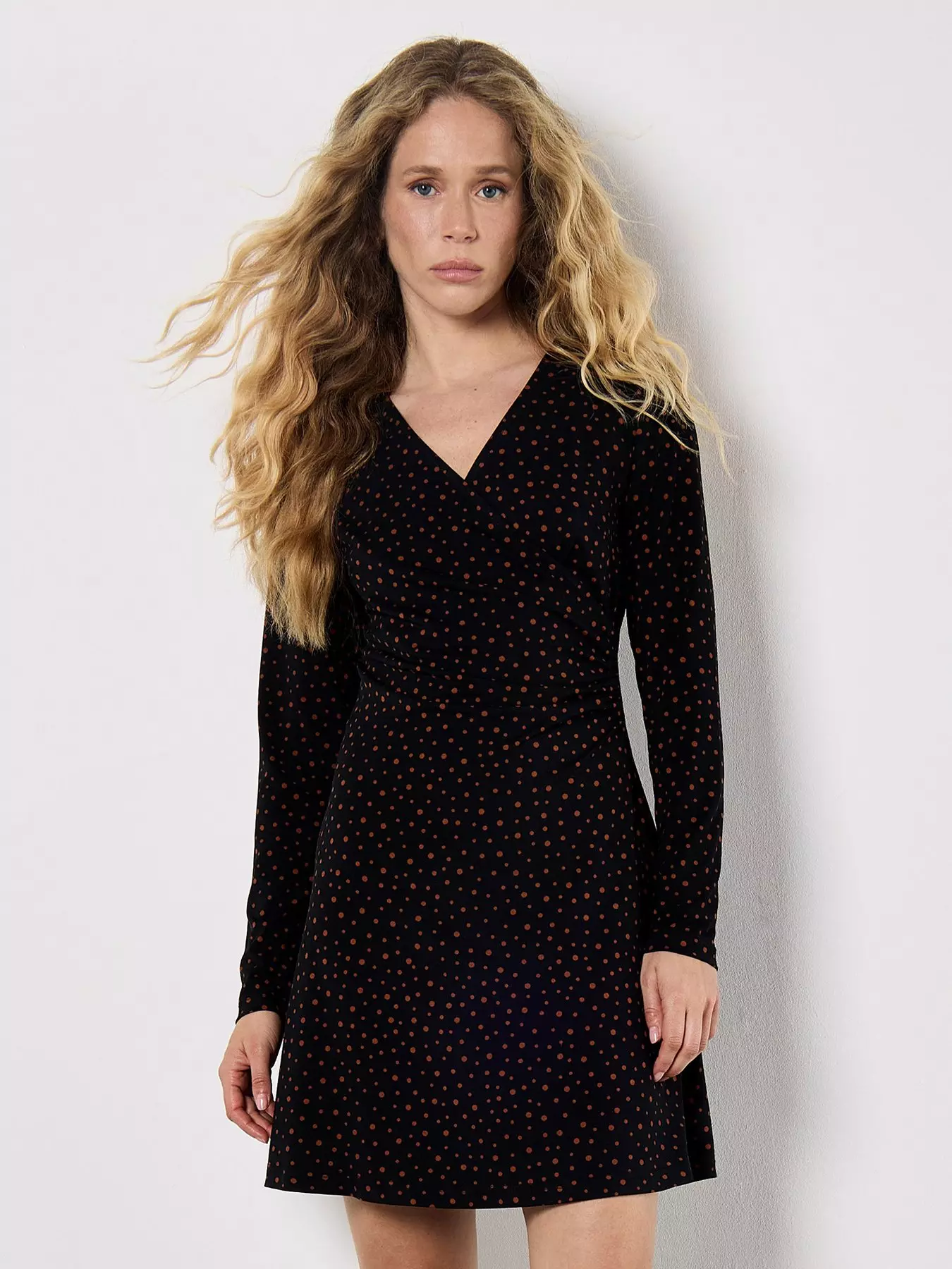 ApricotAssorted Dots Side Ruched Dress - Black