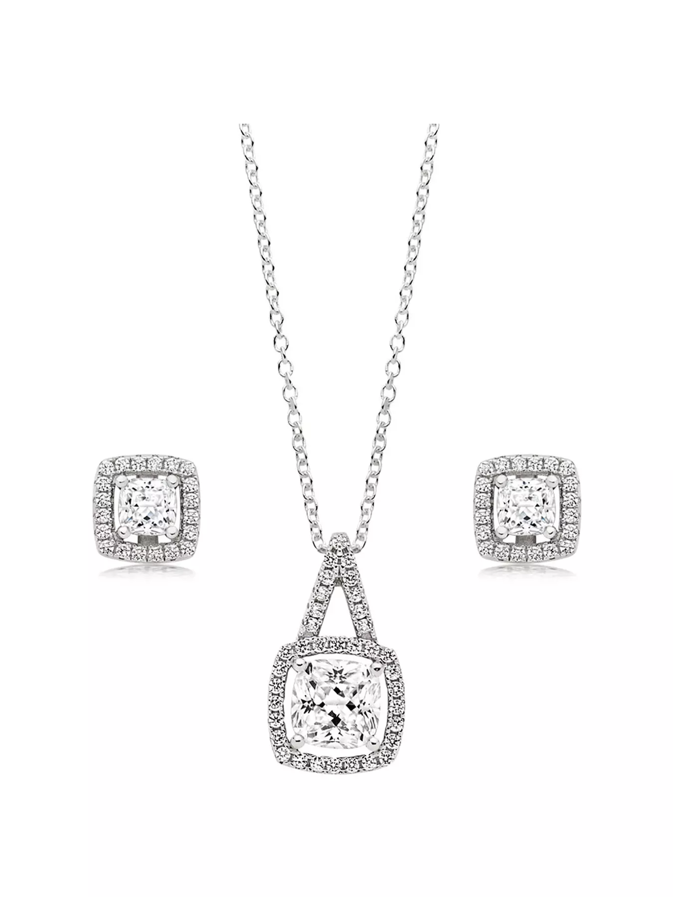 Enhance your glamorous style with this Silver Cubic Zirconia Square Halo Pendant and Earrings Set, taking you from day to night in never-ending style.At A Glance