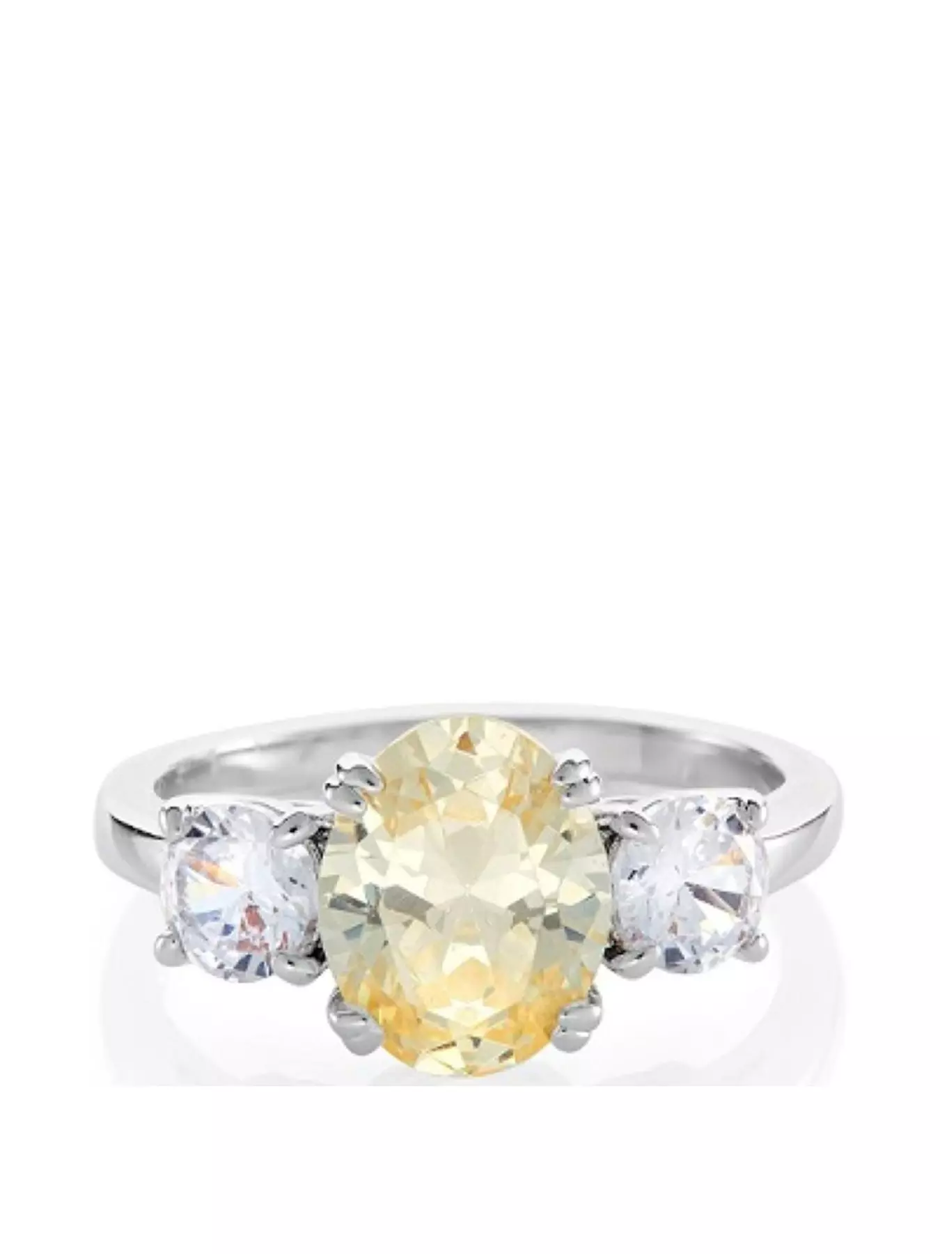 A truly dazzling design, this stunning ring features a canary coloured oval centre stone between two smaller brilliant cut clear cubic zirconia stones. Flawlessly faceted to reflect the light for diamond inspired look, this ring brings eye catching elegance to every occasion. Rhodium plated. Centre stone size 10.8mm with two 5mm stones. Comes packaged in a Buckley London gift box and with a Gift Bag.Use the right and left arrows to scroll through the image carouselPage 1 of 322