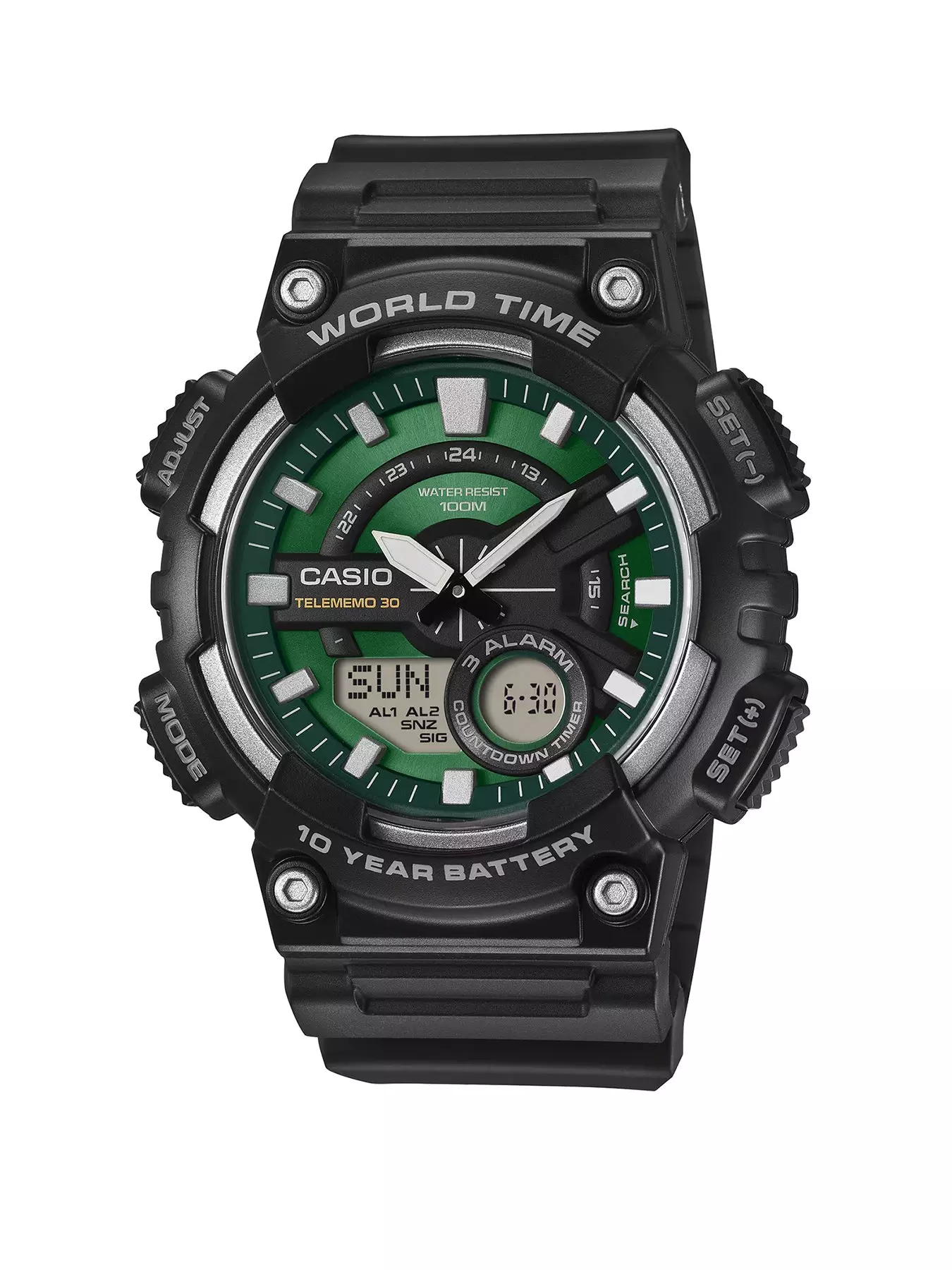 CASIO collection men's watch with a Telememo 30 databank, 3 daily alarms, world time mode, 1/100th sec stopwatch, countdown timer and Neobrite hands. It's also 100m water resistant making it suitable for swimming and sports.- 24Hr Display: Y