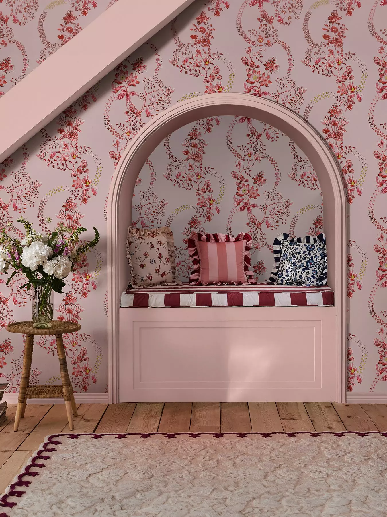 Road Floral Pink & Red wallpaper is full of movement and charm. Trailing florals in rosey reds and blush pinks weave in delicate, looping paths-each stem sprinkled with ditsy pixel details inspired by vintage board games and stitched-like motifs, as if sewn with love. Accentuated by pops of sunshine yellow throughout to bring fun and character.It's a print made for dreamers, perfectly suited to bedrooms, playrooms or anywhere in need of a rosy glow and a little floral wonder.
