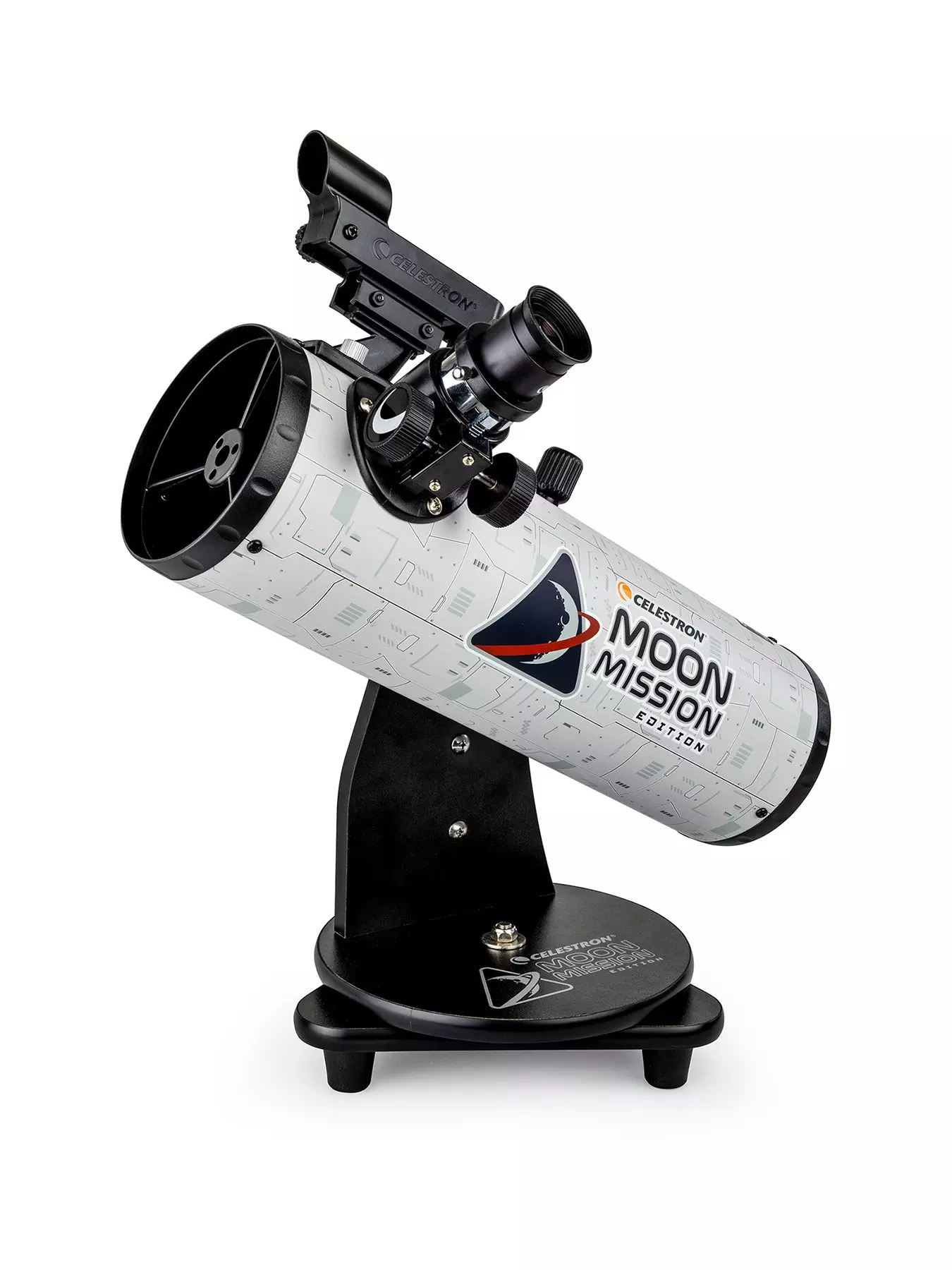 The special edition Moon Mission Tabletop Dobsonian offers high-quality performance at an exceptional value. This quality Dobsonian-style telescope features a parabolic glass mirror with a generous 100mm of aperture. The parabolic mirror delivers a wider field of view than other 100mm Newtonians, plus sharper views of the Moon's surface details and crisp, pinpoint stars. You'll also enjoy using the telescope to pan the Milky Way, explore open star clusters, marvel at Saturn's rings, or view favorite deep-sky objects like the Orion Nebula. This compact, lightweight telescope is an ideal entry-level astronomical telescope. Just remove it from the box, insert an eyepiece, and you're ready to view. To navigate the sky, rotate the azimuth axis toward your desired object. It doesn't get much simpler or more portable than that. This compact design is perfect for your next camping trip, picnic, or hike. The Moon Mission Edition Dobsonian will be a stylish decorative fixture on your bookshelf or desk when not in use.