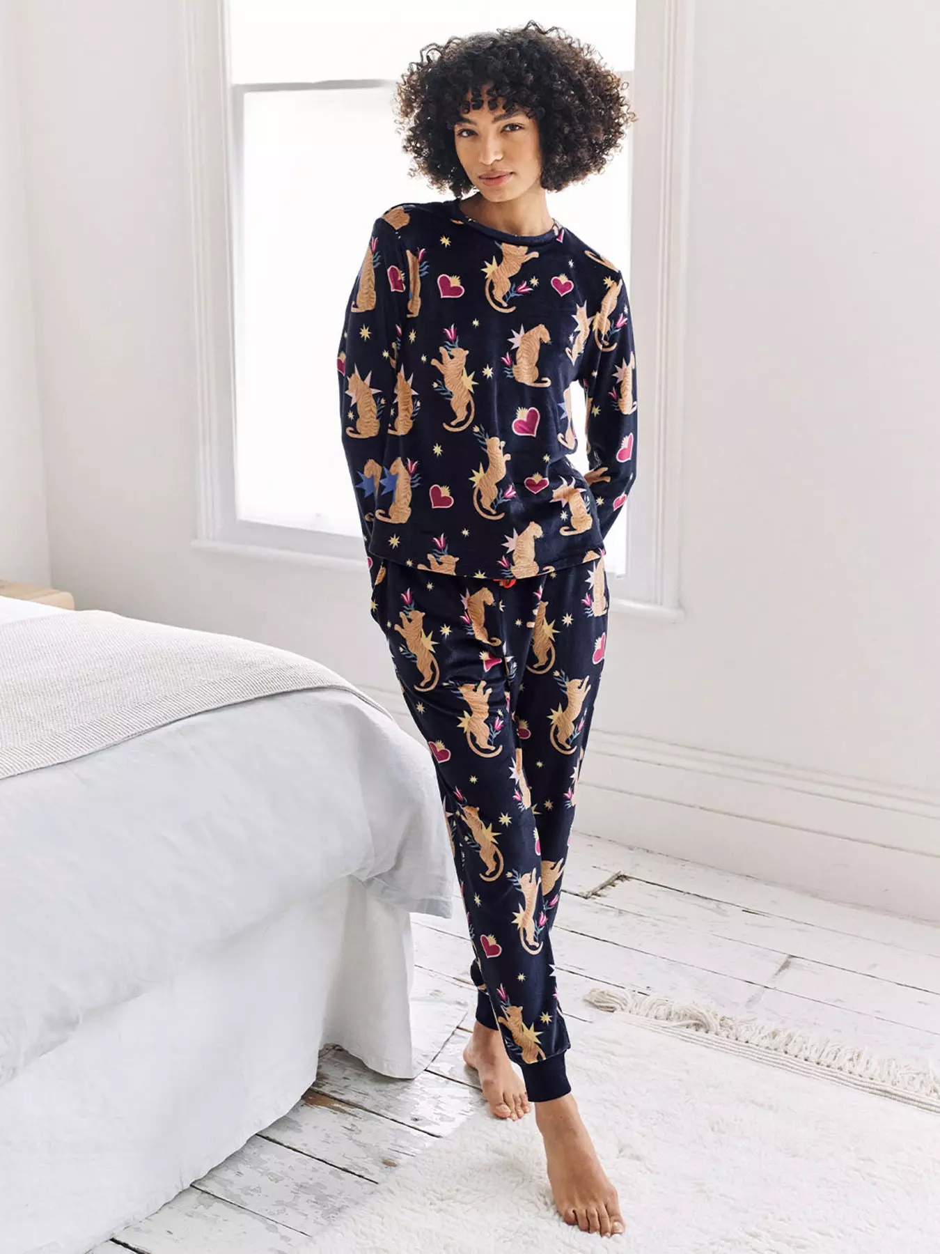 Slip into a dreamscape where tigers dance beneath enchanted moons and stars glimmer between blossoming foliage. This velour jogger set wraps you in midnight magic, its soft, velvety touch echoing the richness of the Enchanted Tiger print, alive with prowling big cats, twinkling constellations and golden-framed hearts. With its relaxed crew top, drawstring joggers and easy pockets, its loungewear that feels as spellbinding as it looks.About the brand: