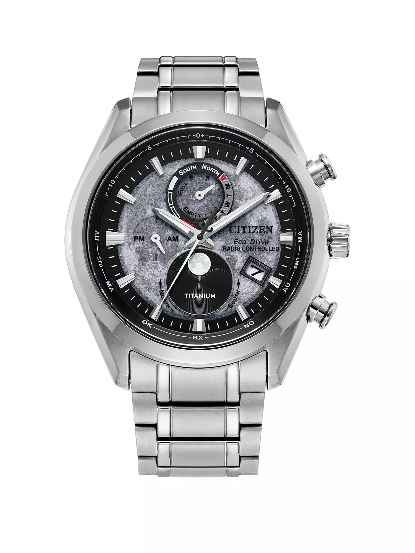 H874 movement that provides ±15 seconds accuracy per month, revolutionary proprietary Super Titanium material and artfully crafted moon pattern dials. Based on a unique mathematical formula developed by CITIZEN called 'Luna Program', the watch calculates the phase of the moon each day from signals received from multi-band radio transmitters.