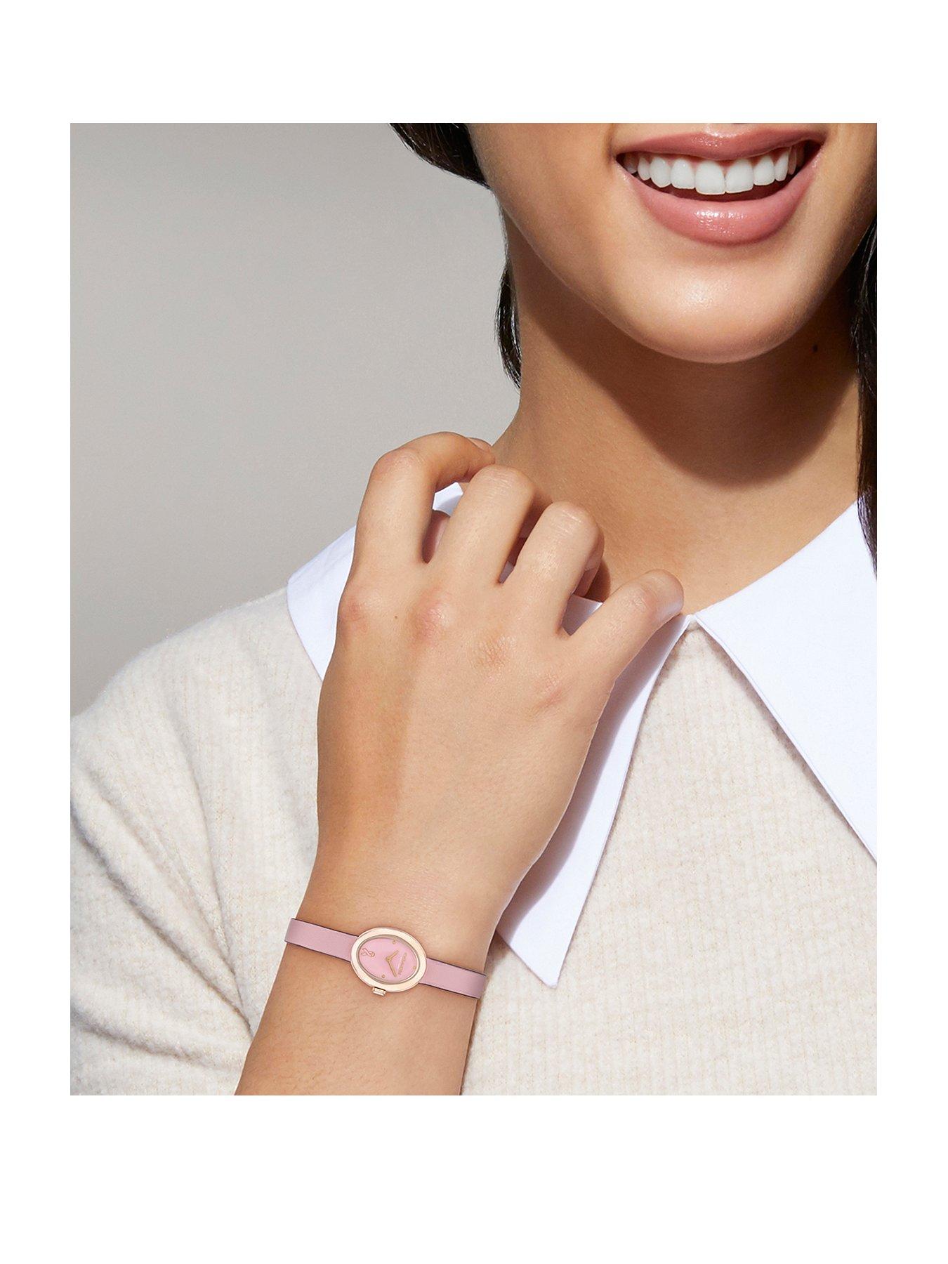 Coach ladies 22mm light gold IP case, lacquered pink dial with pink enamel ribbon, pink leather strap. Water resistant to 3ATM