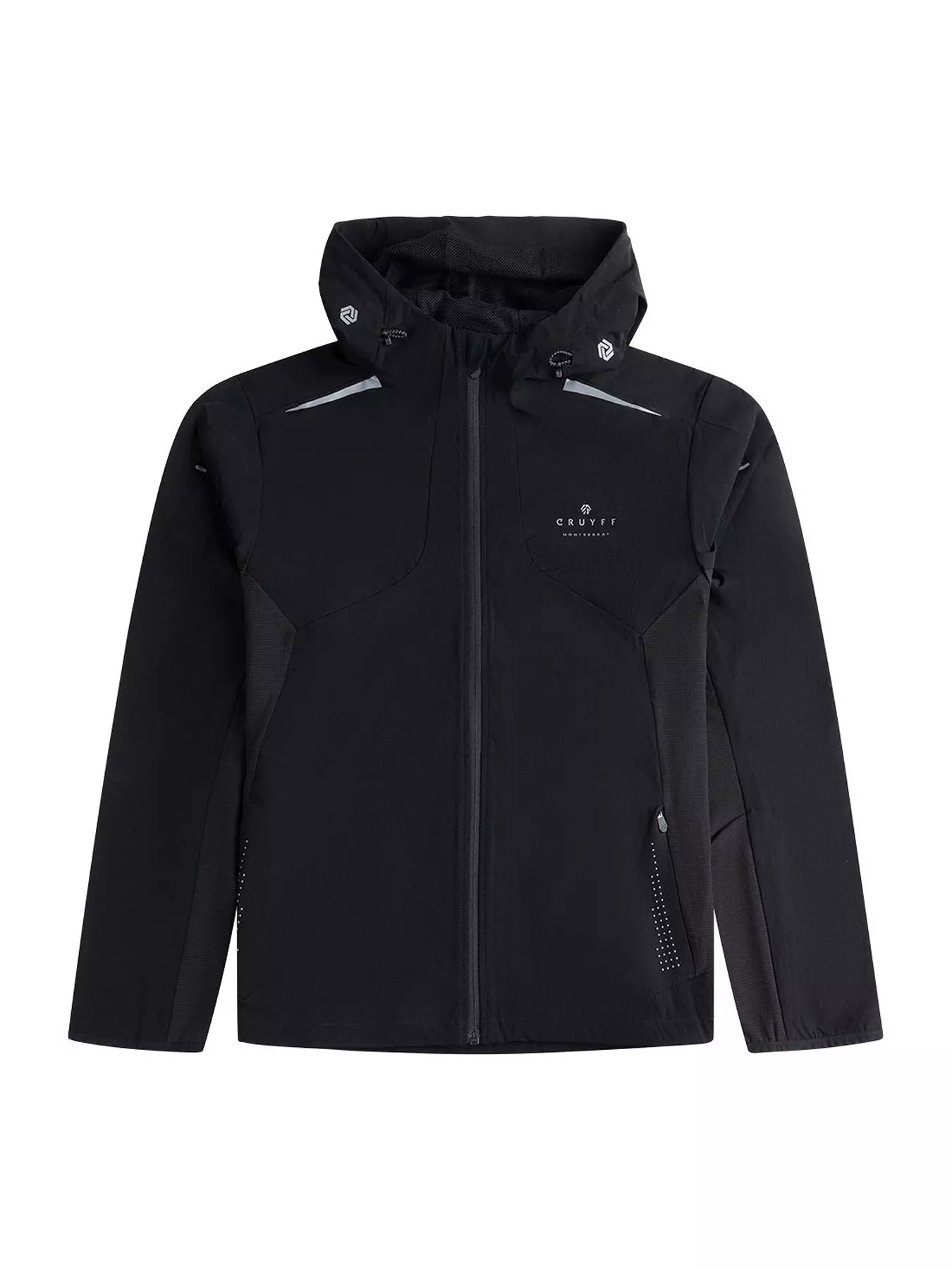 - The Cruyff Essential Peak Jacket in Black for men. A lightweight jacket made from 90% nylon and 10% elastane, combining comfort, visibility, and movement. Features front pockets, reflective accents, and Montserrat logo branding on the back for functional style. The regular fit ensures comfort for active or casual wear.