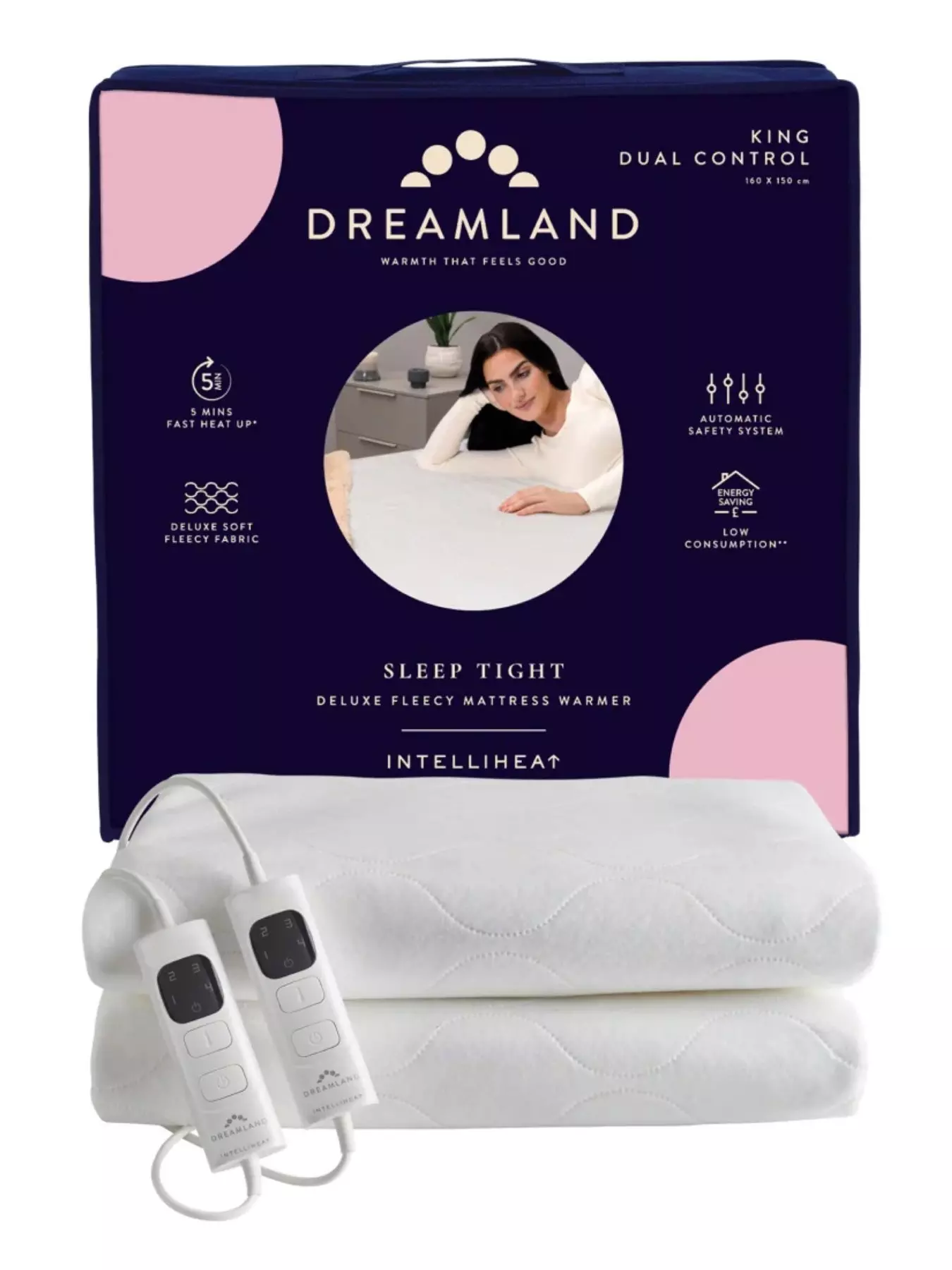 Drift off to a blissful night's sleep with our deluxe warming underblanket. This cosy, fleecy, King underblanket is soft to the touch and durable, adding an extra layer of warmth to your bed. Quick to fit, thanks to elasticated straps, and an automatic shut-off timer of nine hours meaning plenty of time to sleep tight in comfort and warmth. King with 2 controls. 5 minute fast heat up and 4 temperature settings & detachable control. Machine washable and tumble dryer safe; Energy saving & low consumption.Intelliheat, always the right warmth. Intelligent software and a 5-layer ultra-thin heating sensor wire built in to our blankets to detect its temperature 25 times per second, automatically regulating warmth safely.