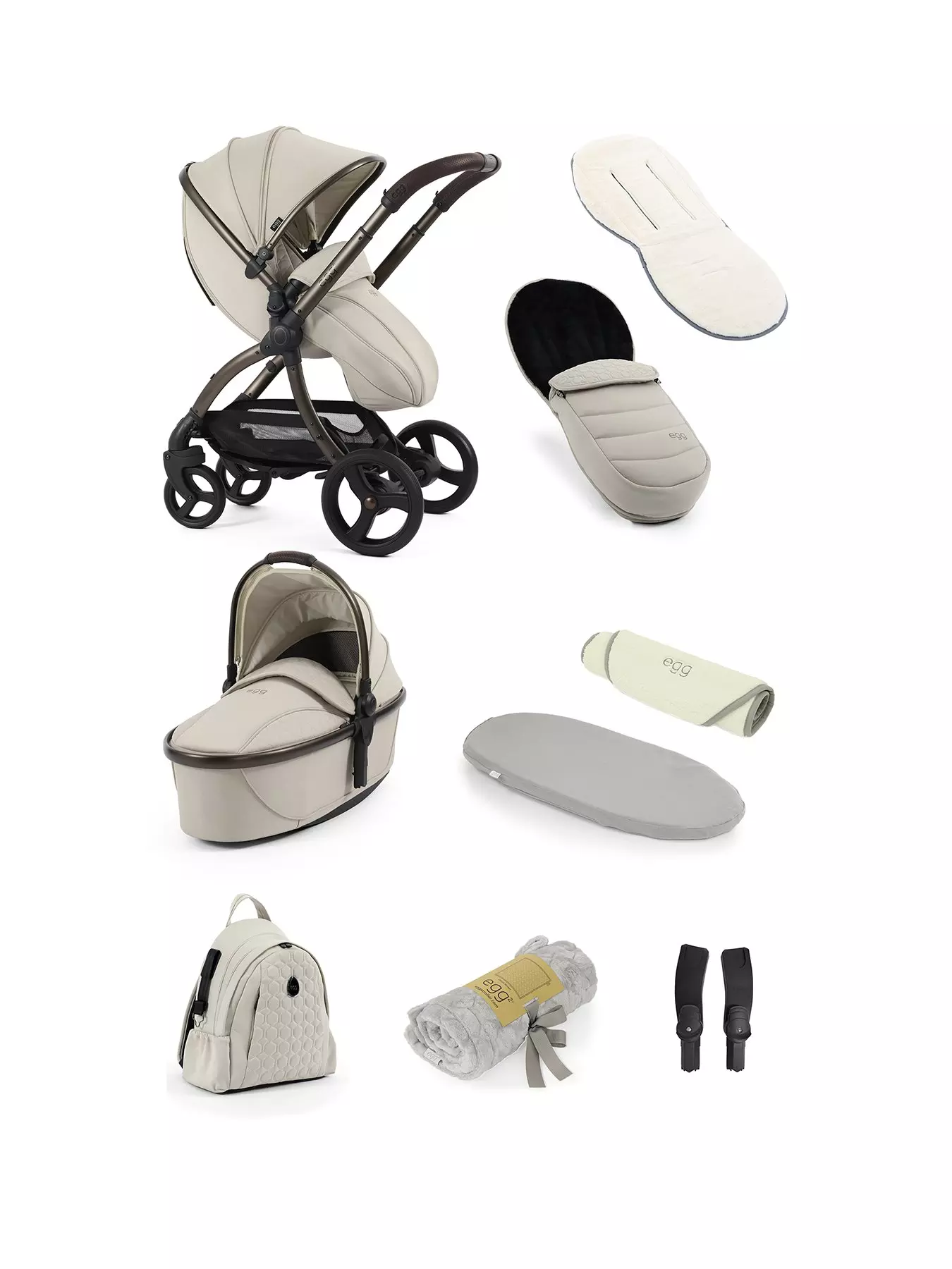 9-PIECE SNUGGLE PACKAGEThis 9-piece snuggle package includes the egg3 stroller, carrycot, carrycot sheets, sherpa carrycot mattress topper, backpack, footmuff, fur seat liner, blanket and the multi car seat adaptors.