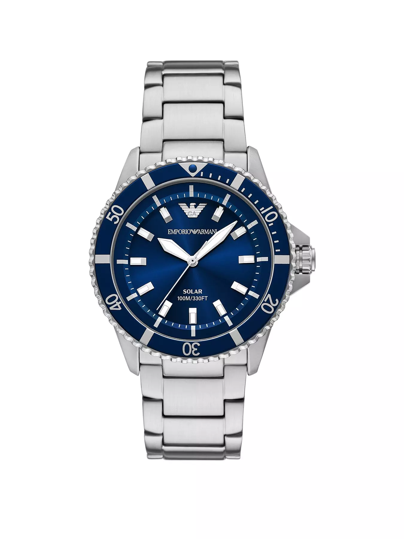 - Emporio Armani's 42 mm World Explorer solar-powered 3-hand watch features a blue sunray dial, sapphire crystal, and a stainless steel bracelet. Its solar-powered movement ensures reliability and eliminates the need for frequent battery replacements.