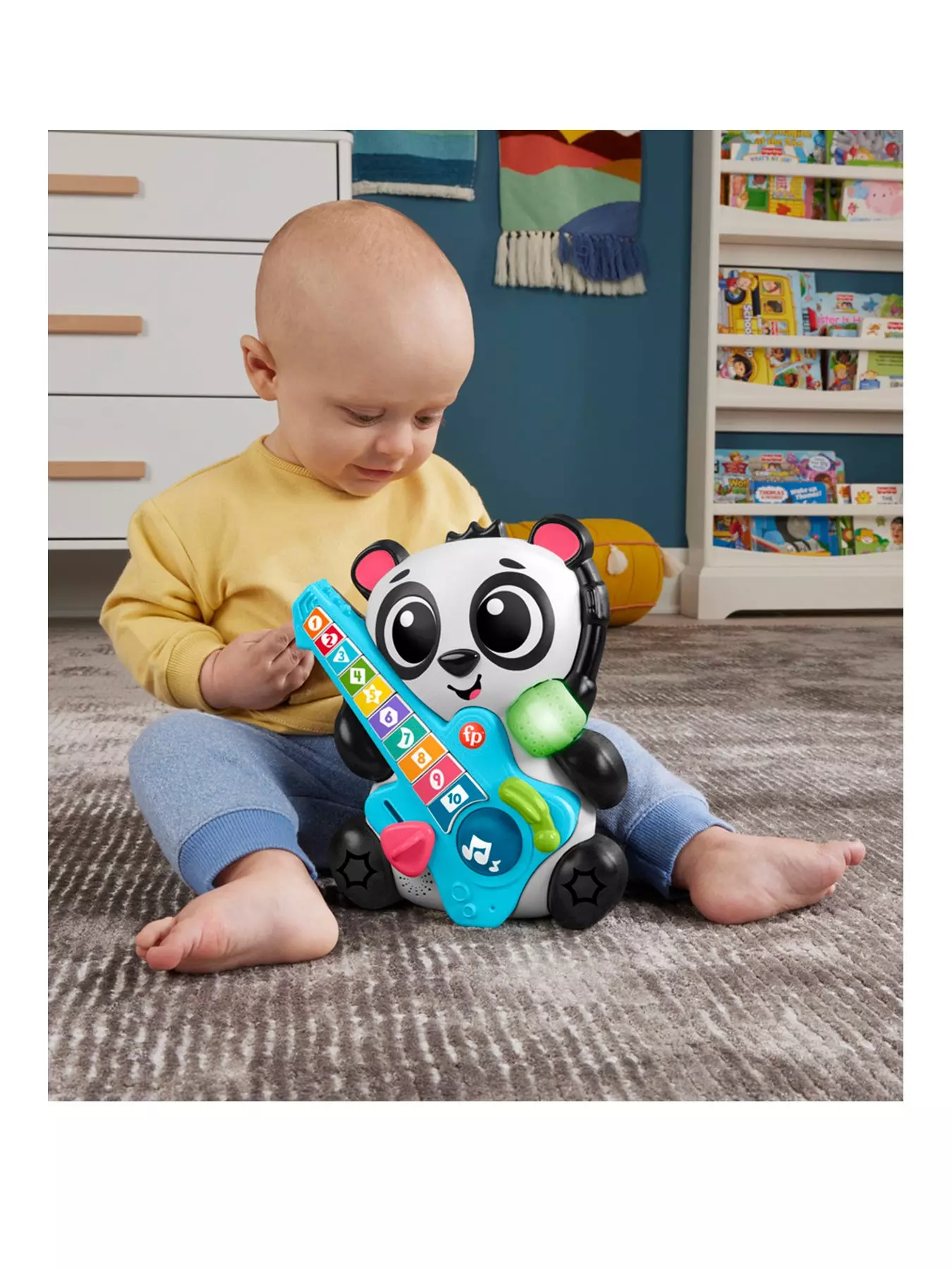 When kids press the 10 colorful guitar buttons or spin the roller ball, Panda's microphone lights up to sync to the beat with songs, sounds and phrases about counting and more.