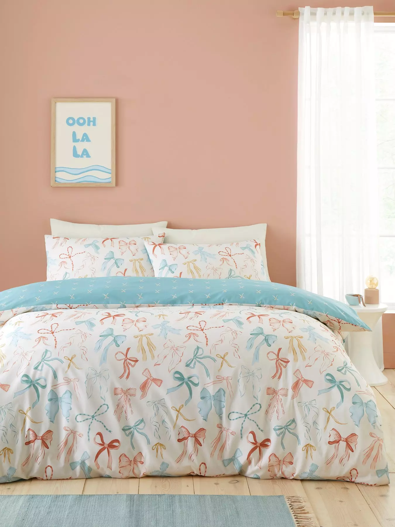 Introducing the Fusion Evelyn Duvet Cover Set - a vibrant fusion of style and comfort! Adorned with hand-painted multicoloured watercolour bows on the front and a charming small bow print on a duck egg reverse, this set brings a playful touch to your bedroom. Made from soft polycotton and completely reversible, it's the perfect blend of contemporary design and high quality at an unbeatable price. Dress your bed in fashion-forward flair with Fusion!- Depth: 1 CM