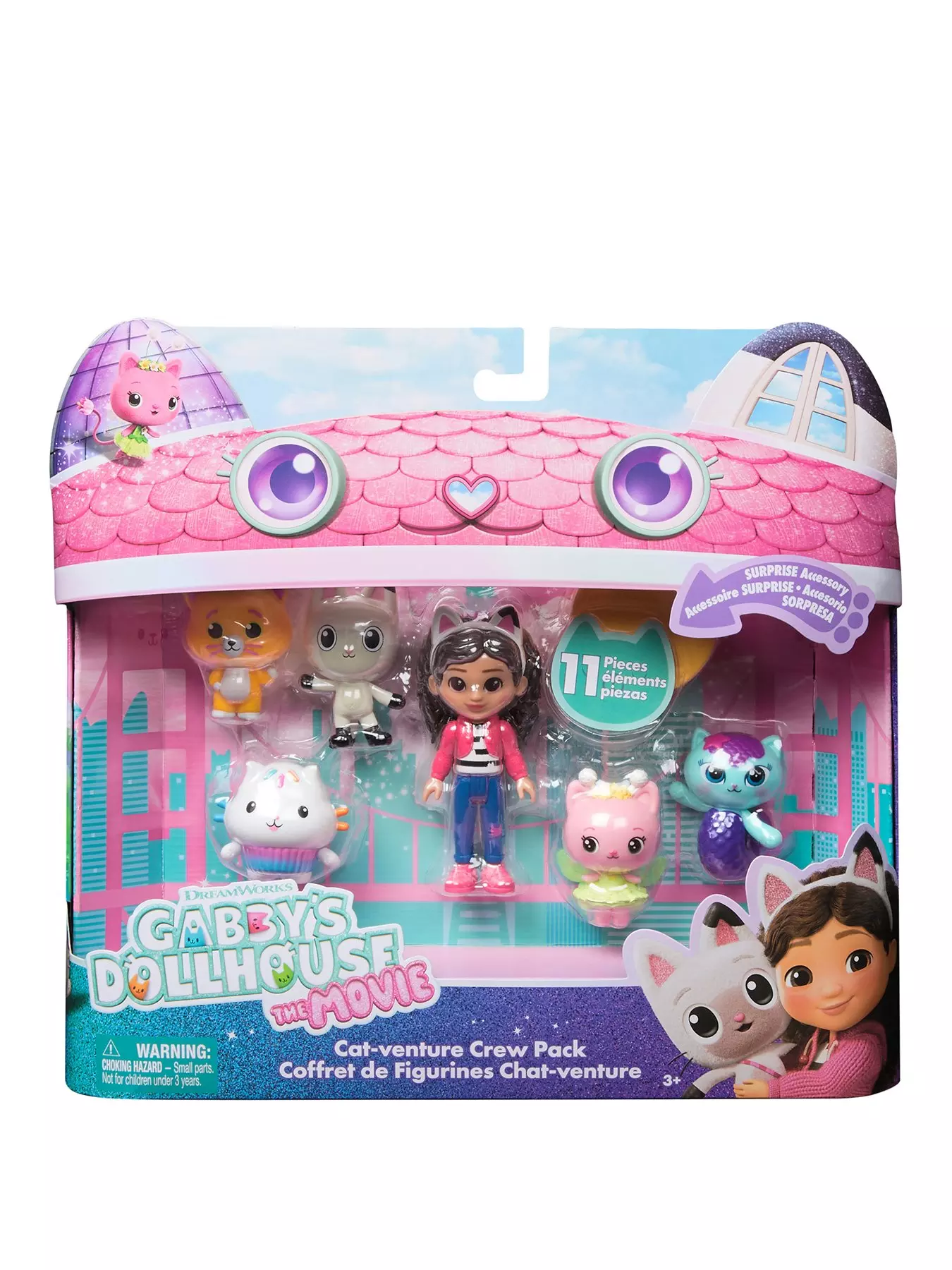 Enter the magical world of Gabbys Dollhouse: The Movie with the Cat-venture Crew Pack. This exciting set includes 11-piece movie figures set with Gabby Girl, Pandy Paws, Kitty Fairy, MerCat, Cakey & Chumsley, each looking just like they do in the Gabbys Dollhouse: The Movie. Gabby stands 8.8cm tall with movable head and limbs, inviting kids to create adventures. Pandy Paws has a messenger bag, Cakey sports a chefs hat, and Chumsley wears a bow tie. Unbox the Dollhouse Delivery, just like Gabby does in the show, to find a surprise accessory, then scan the QR code to unlock a surprise in the Gabbys Dollhouse app. This set is a fun-filled way to inspire pretend play and invites meow-mazing explorations, with these adorable Gabby cat toys for kids. Gabbys dollhouse toys are purrfect gifts for kids to relive cherished moments from the Gabby film, and for creating new adventures in Gabbys dollhouse, with toddler toys & toys for girls like dolls house accessories & furniture, her meow-mazing cat friends and fin-tastic mermaid toys, for endless hours of cat-terrific adventures (each sold separately)- This 11-piece set includes Gabby, Pandy Paws, Kitty Fairy, MerCat, Cakey & Chumsley—each figure looks just like they do in Gabby’s Dollhouse.