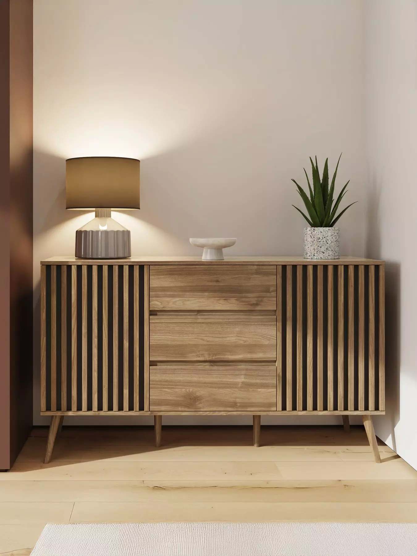 This large sideboard has a stylish slatted finish to the two doors which stands out brilliantly thanks to the black base. Inside each cupboard is a shelf to help maximise your essentials, while three drawers offer extra storage room and glide smoothly open on metal runners.