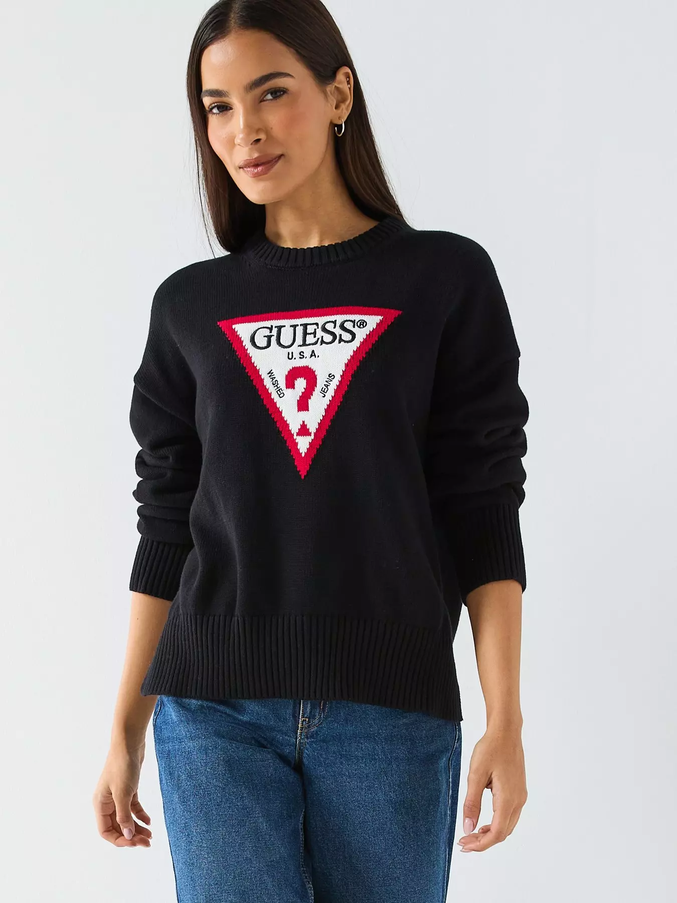 - A timeless knit with a luxe edge, this soft cotton sweater brings effortless warmth and signature Guess style. The iconic triangle logo amps up the everyday, while the ribbed texture creates a flattering, easy-to-wear silhouette.
