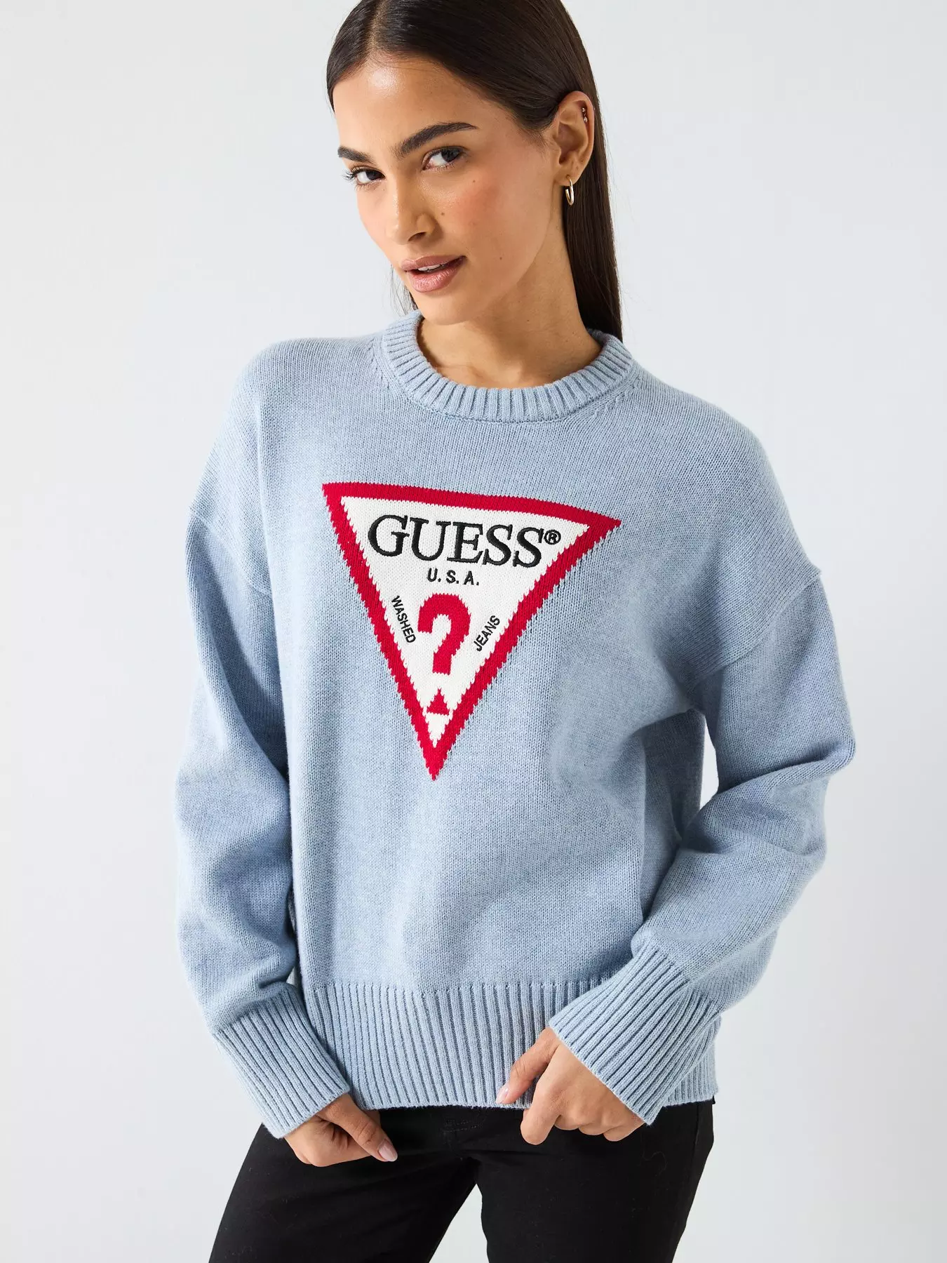 • Image 2 of 6 of Guess Jeans Long Sleeve Big Triangle Sweater  - Blue