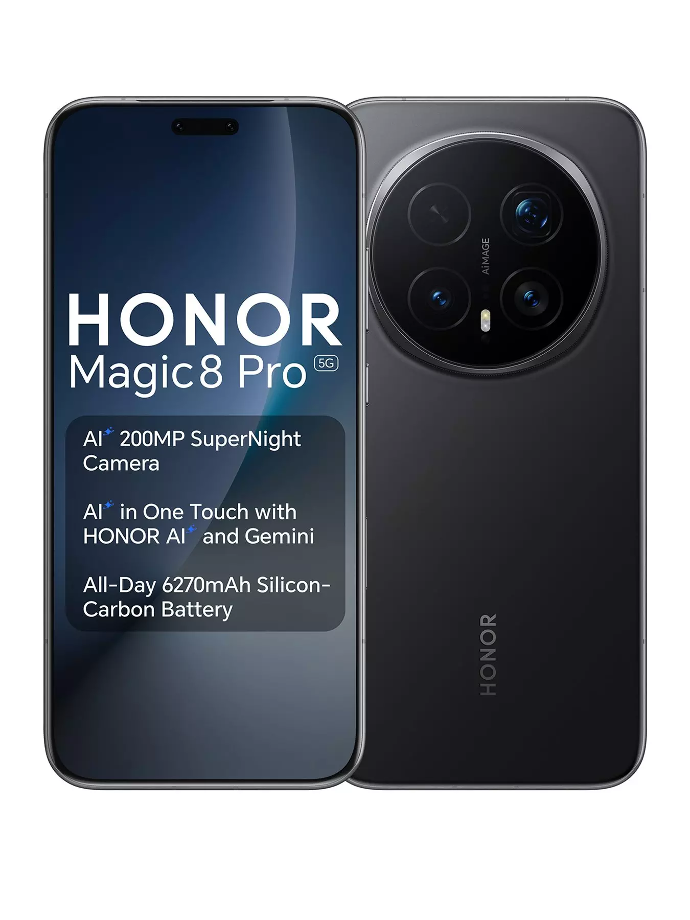 INCREDIBLE CAMERASHONOR Magic8 Pro 5G redefines low-light photography thanks to its AI 200MP SuperNight Telephoto camera, 50MP SuperNight Main camera and 50MP Ultra-Wide camera. The AI HONOR Image Engine gives you AI Telephoto Mode, AI Harcourt Portrait Mode, AI Low-Light and Stage Mode, and AI High-Definition Continuous Shoot Mode with Motion Sensing Capture. There's also a 50MP front-facing selfie camera paired with a 3D lens to deliver 4K video capture and high-definition selfies.