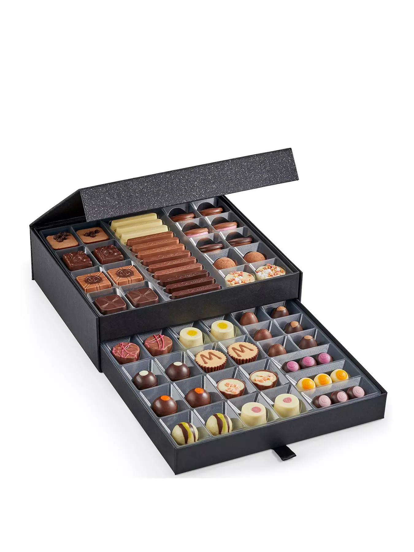 A statement-making large chocolate box from Hotel Chocolat, featuring pralines, caramels, alcohol chocolates, macarons reimagined in chocolate and more.In a corner of Hotel Chocolat’s Inventing Room is an elegant dark-wood box with drawers where the chocolatiers keep their working creations. Modelled after it, the Classic Cabinet’s collection of milk, dark, caramel-milk and white chocolates presents some of their most celebrated recipes in statement style: think pralines, caramels, fruities, tipsy truffles and more across two glittering tiers.