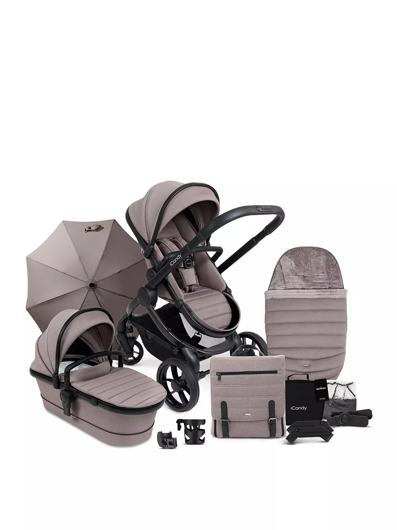 Discover understated luxury with the iconic iCandy Peach 7 in the new Porcini colourway. Featuring soft taupe-toned fabrics and a sleek Jet Black chassis, this elegant pushchair blends style with practicality. The spacious carrycot is suitable from birth and can be used for permanent overnight sleeping with or without the optional iCandy MiStand. The integrated Ride-on Board keeps toddlers close without extending the pushchair footprint. Puncture-proof multi-terrain wheels, an adjustable ergonomic handlebar of up to 105cm and premium knitted jersey fabrics deliver all-day comfort. Whilst included accessories of a matching changing bag and cosy footmuff and liner - complete the package. The Peach 7 in Porcini is the perfect balance of timeless design and everyday functionality.- Accessory List: Change bag, Duo Pod, Sun screen, Parasol, Cupholder, Clamp, Raincover, Elevators & Car Seat Adapters