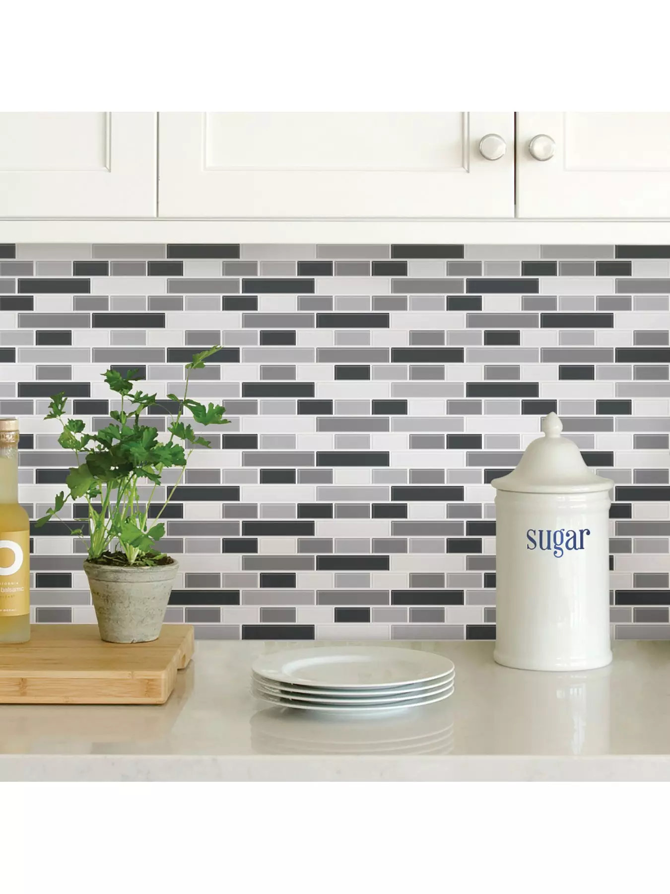 Create a fresh tiled look in your home at a fraction of the cost of the real thing with this pack of 4 Smoked Glass peel & stick backsplash tiles.Unlike real tiles, these 10 x 10-inch panels are quick and easy to apply. Just measure up your available space, cut the sheets to size, remove the back and stick to your wall. No cement, no hanging strips, no difficult installations.