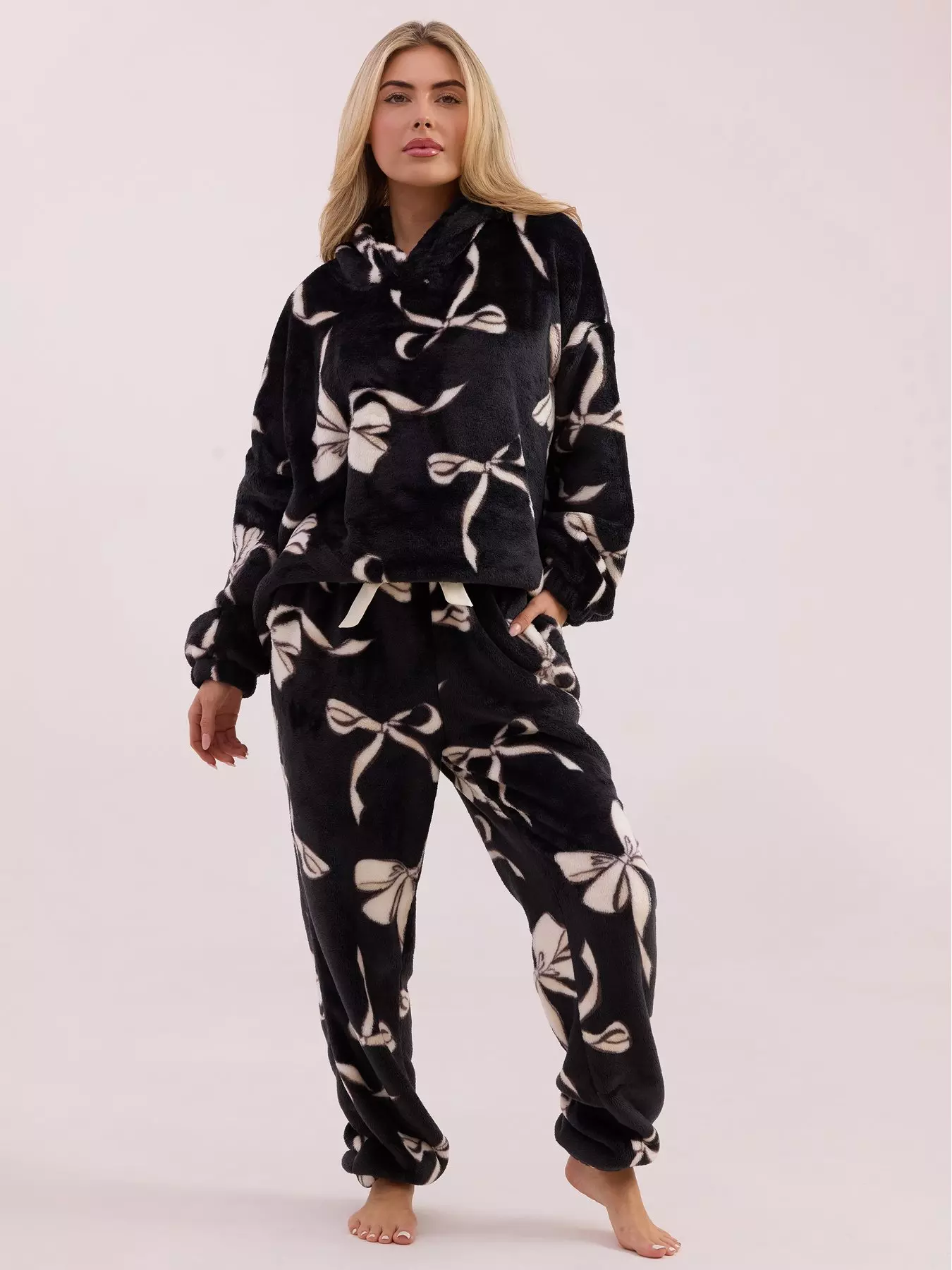 Fun, Funky & Snuggly! This mono bow twosie set is the perfect fleece set to throw on at home! Our comfy hoodie features a sleek hooded neckline and long sleeves that feel like a hug. The joggers' elasticated waist sits comfortably on your hips and the cuffed leg brings the regular fit legs to an elegant taper.- Material Content: 100% Polyester