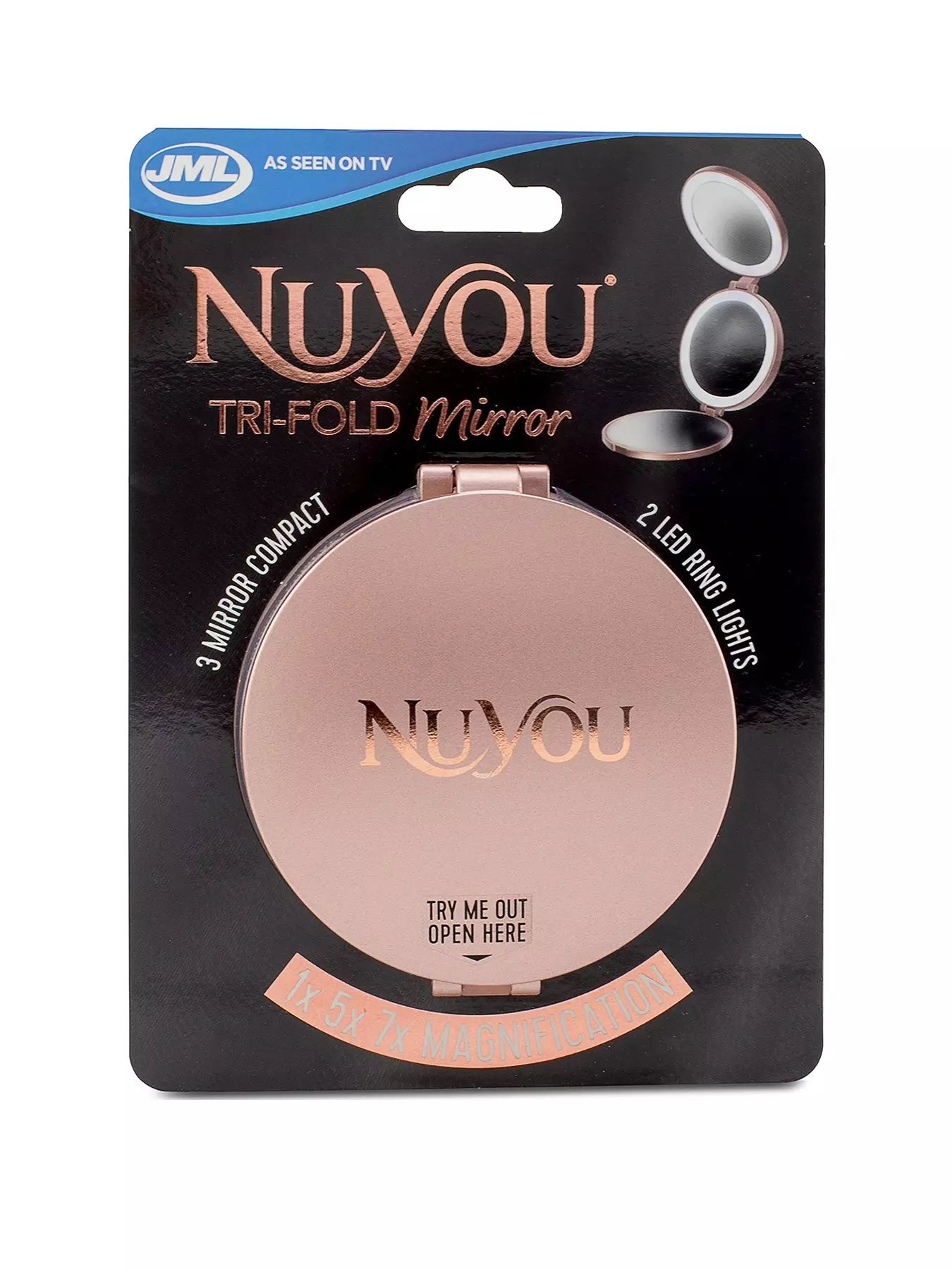 NuYou Tri-Fold Mirror is the ultimate compact mirror that combines magnification with perfect lighting, helping you achieve a flawless look anytime, anywhere! Whether you're at home or on the go, this stylish and compact mirror set has got your beauty needs covered. Don't settle for a single mirror or struggle with inadequate lighting. See clearly, see better, and say hello to a Nu You with the Nu You Tri-Fold Mirror. Elevate your makeup routine, get the perfect look every time, and unlock a world of precision and perfection. Say goodbye to makeup mishaps and hello to makeup mastery!Nu You Tri-Fold Mirror boasts a clever three-panel design, offering not one, but three mirrors with varying levels of magnification. This means you have all your makeup application essentials in a single, sleek compact. Use the standard mirror for everyday makeup, hair touch-ups, or bold lipstick looks. Switch to the five times magnification mirror for precise mascara and lip gloss application or to create mesmerizing smoky eyes. For the utmost precision, the seven times magnification mirror is perfect for flawless lip liner and precise tweezing, ensuring your final look is impeccable.
