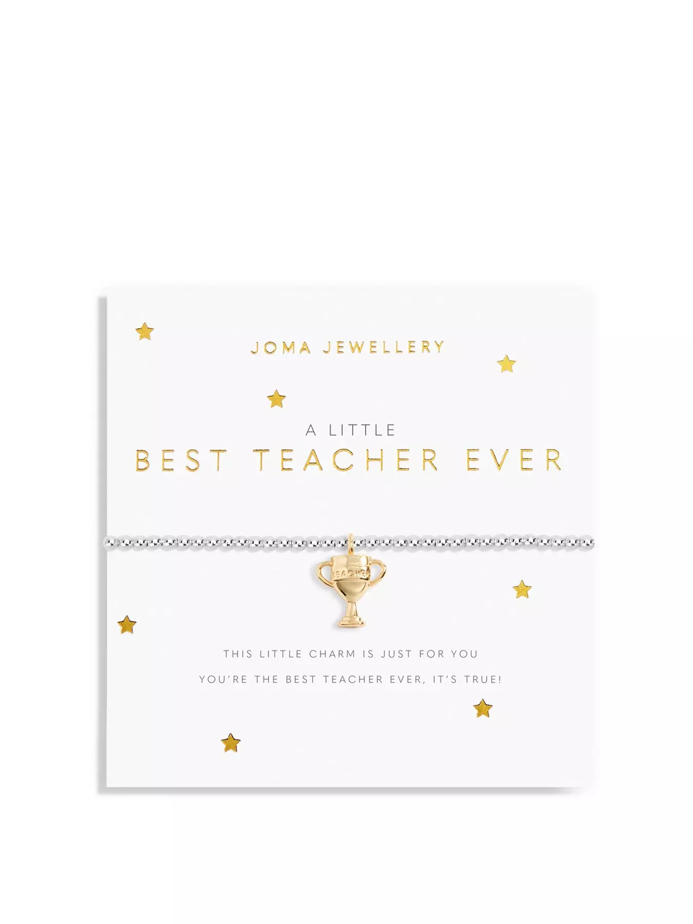 This A Little 'Best Teacher Ever' Bracelet from Joma Jewellery is the ultimate gifting option, boasting a stretch-bead style that ensures a comfortable fit on any wrist. The bracelet is adorned with a gold-plated charm, which is wrapped around one of their stylised cards and framed by a heartfelt poem, perfect for thanking that special teacher. 17.5cm stretchUse the right and left arrows to scroll through the image carouselPage 1 of 322