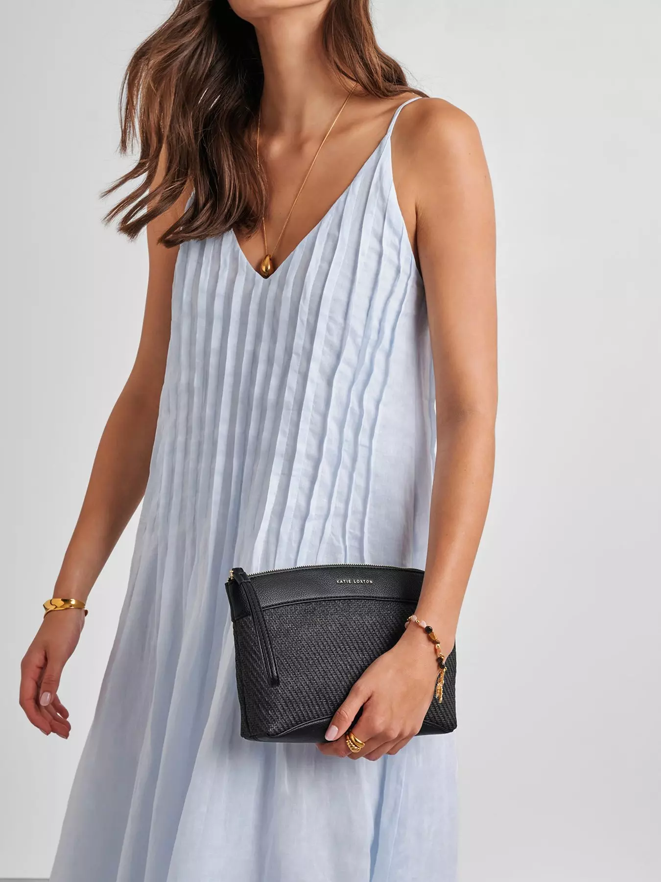 Elevate your everyday style with the Wristlet Clutch from Katie Loxton. Made from natural raffia with vegan leather trims and gold-tone hardware, this stylish accessory blends texture and sophistication effortlessly. It features a wristlet zip pull and a spacious internal design, making it perfect for carrying your essentials from day to night.- Washing Instructions: Wipe Clean