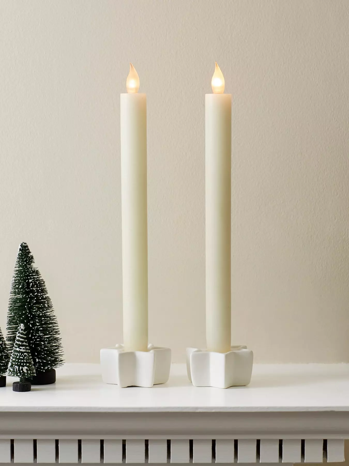 Modern LED technology meets timeless design for a beautiful product that's built to last. Crafted in ivory wax for a timeless look, this ivory duo features squidgy perspex wicks, each containing one flickering warm white LED for a nostalgic glow. These classic taper candles are an elegant addition to mantelpieces and table centrepieces alike. The innovative push top flame design makes this duo an event essential, plus they're slightly tapered at the base for the perfect fit in any standard candle holder. To illuminate, simply insert 2 x AAA batteries (not included) into each candle and push the wick downwards to switch on or off. Expect up to 180 hours of illumination before the batteries will need refreshing.- Depth: 2 CM