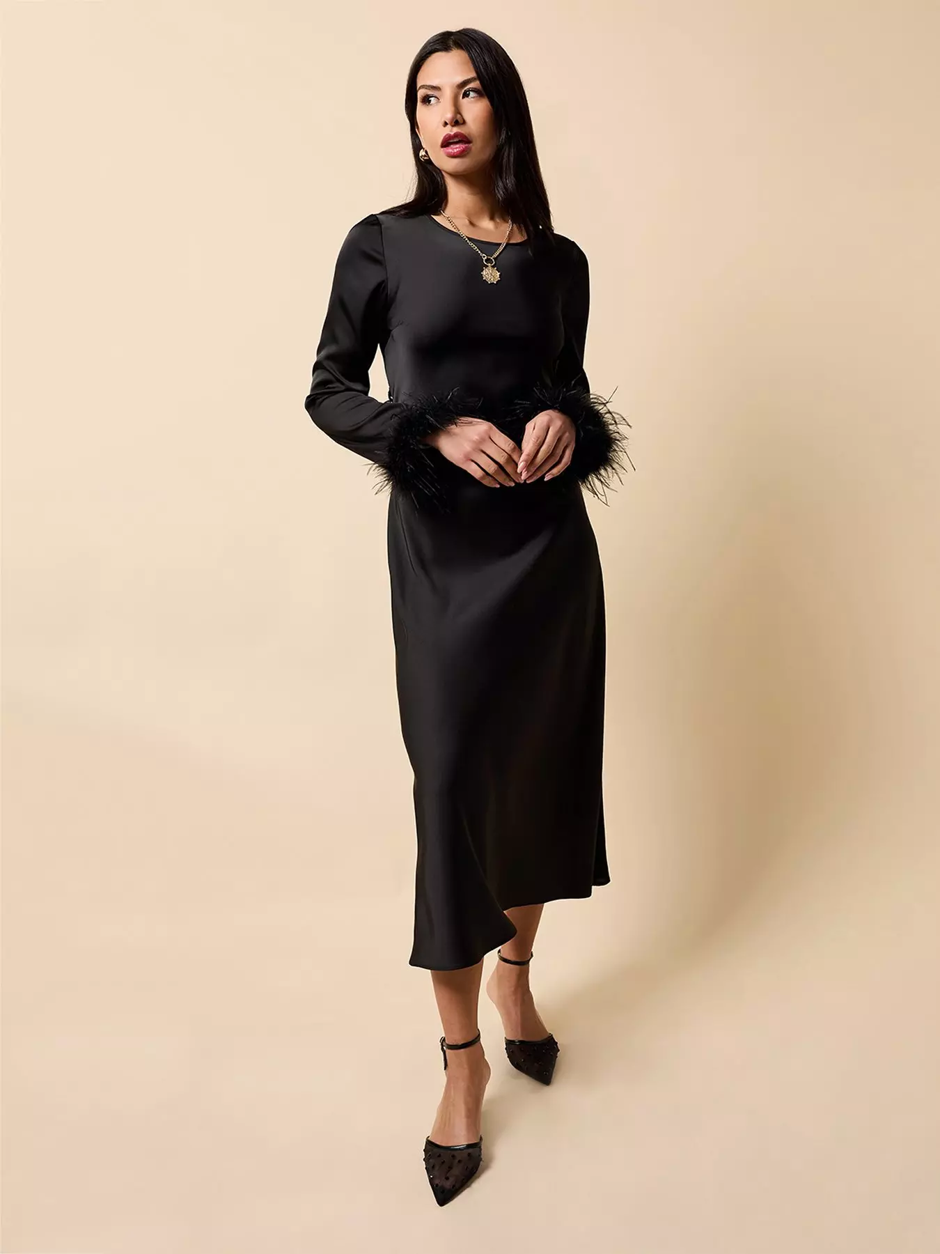 Little MistressSatin Feather Trim Sleeve Midaxi Dress - Black
