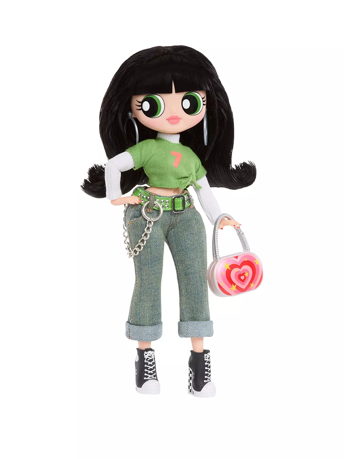 Buttercup the tough one - full of attitude, confidence, and sporty style. This fashion doll channels Buttercup’s signature green look with a modern twist: edgy streetwear, bold accessories, and a hairstyle that says “I mean business.” Her outfit is designed to reflect her fearless personality, with cool textures and standout details that make her pop on the shelf or in play.Like her sisters Blossom and Bubbles, Buttercup comes with a full outfit, shoes, and themed accessories - plus a doll stand for display.