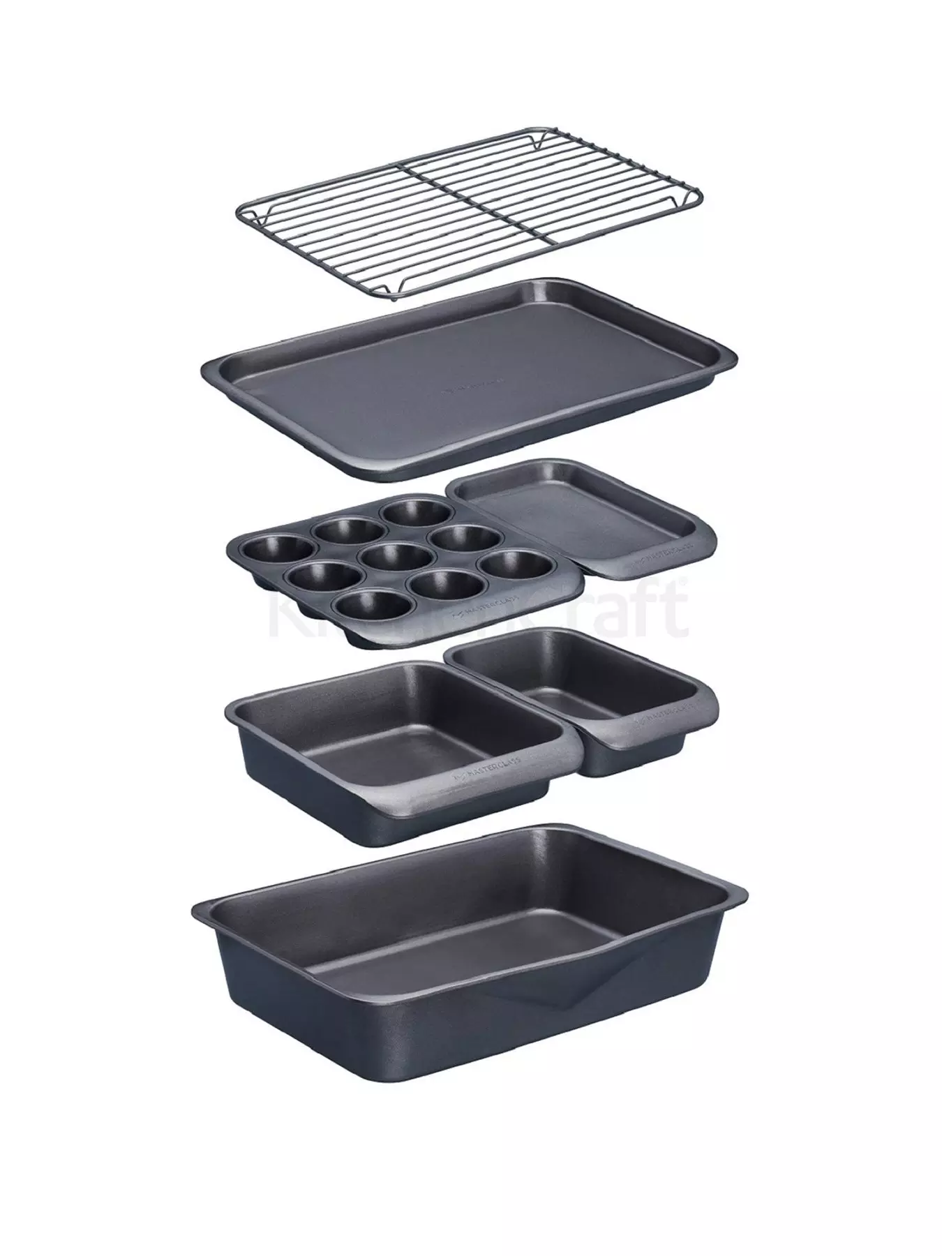 - INCLUDES... roasting pan, square cake tin, muffin tray, two baking trays and a cooling rack