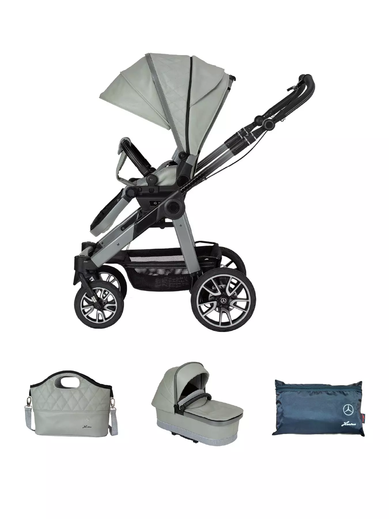 E.A.N: 4 0 1 5 5 3 8 0 9 2 8 5 0Mercedes All-Terrain GTR Pushchair, Carrycot & Changing Bag Bag - Sage Grey