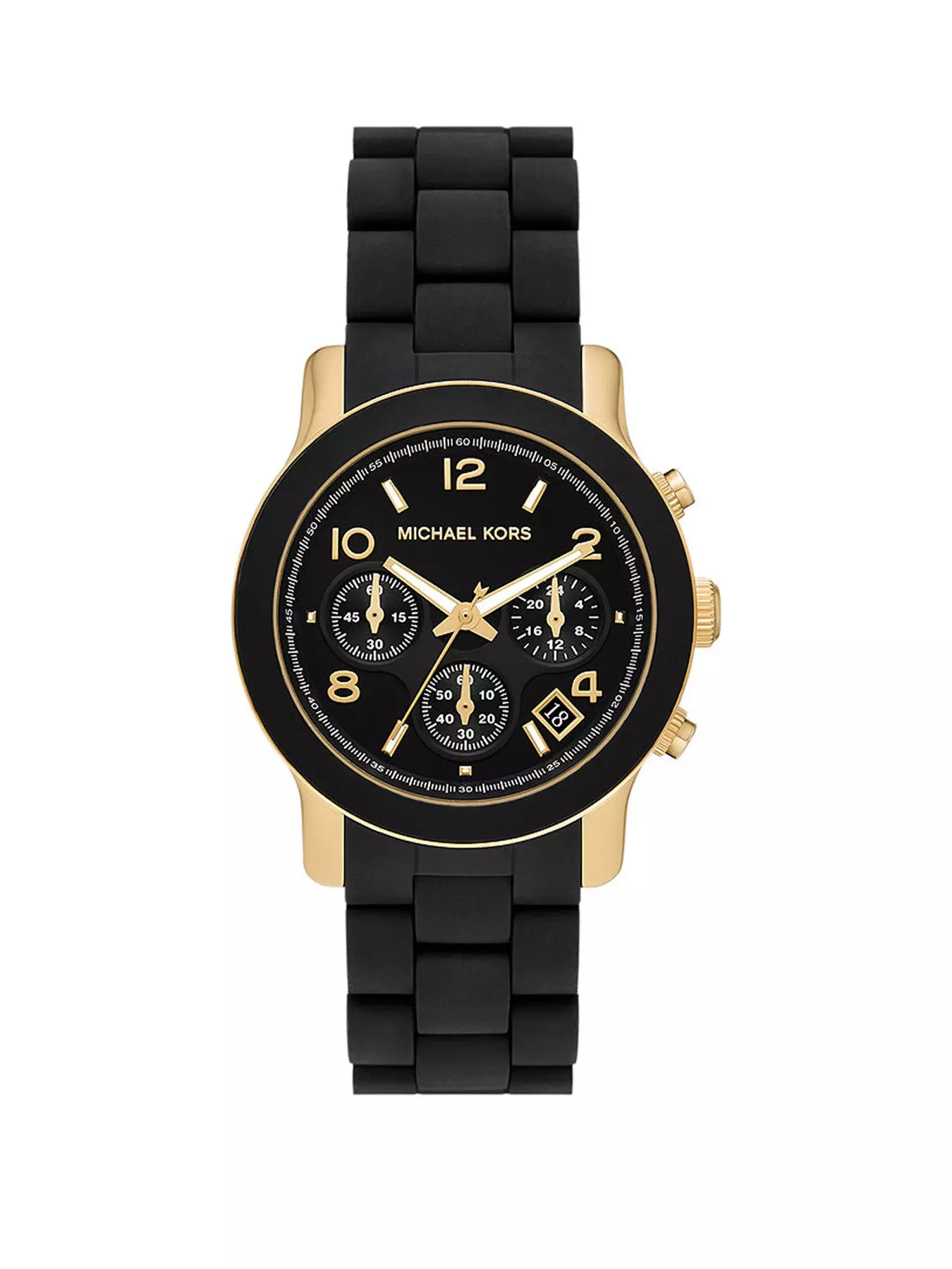 Michael Kors' 38mm Runway watch features a black brushed dial, chronograph movement and gold-tone stainless steel and black silicone strap.- Fastening Type: Bracelet