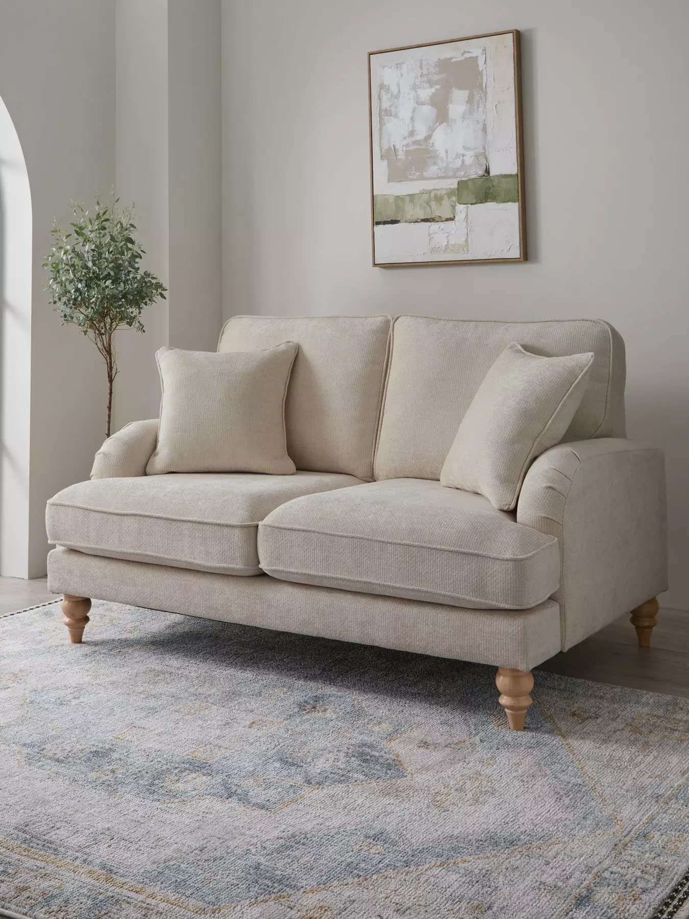 This sofa from Michelle Keegan's Hepburn range is upholstered in a wonderfully textured fabric that comes in a choice of grey or natural. The classic bridgewater design sees the arms set back from the front of the seat cushions, and it's detailed with turned wooden feet and a pair of accent cushions.