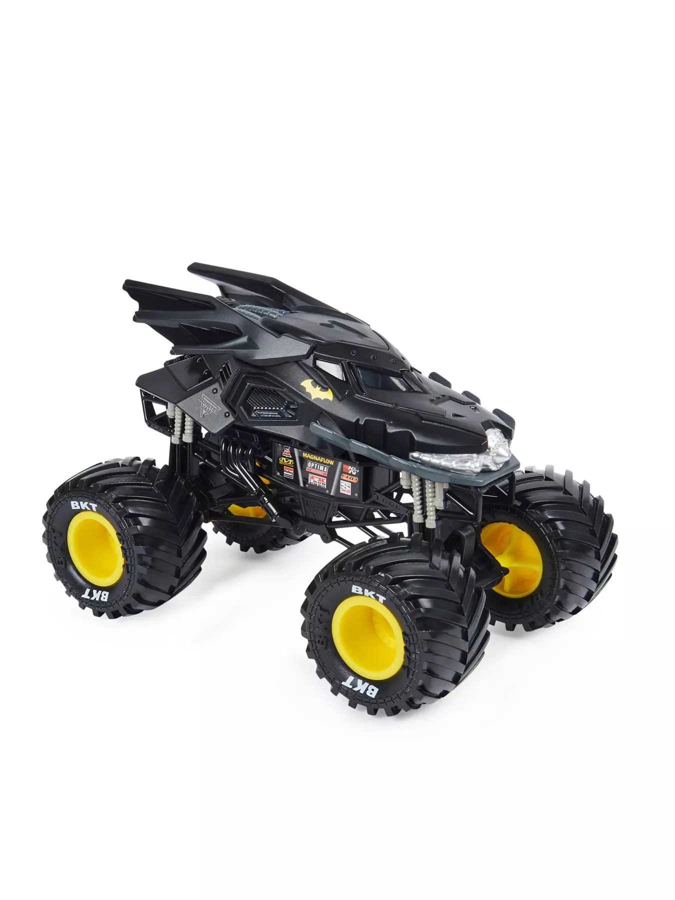 Featuring awesome details and graphics, this Batman-themed authentic replica embodies the style and swagger of the real thing. Official BKT rubber tyres provide greater traction, so you can take your truck to new heights and strike fear in the heart of criminals everywhere.This beast also boasts a working suspension system that absorbs more impact, so the high-flying, car-crashing, truck-trashing jumps never stop! With more trucks to collect than ever before, hosting your very own Monster Jam event is easy - maybe this time in Gotham?