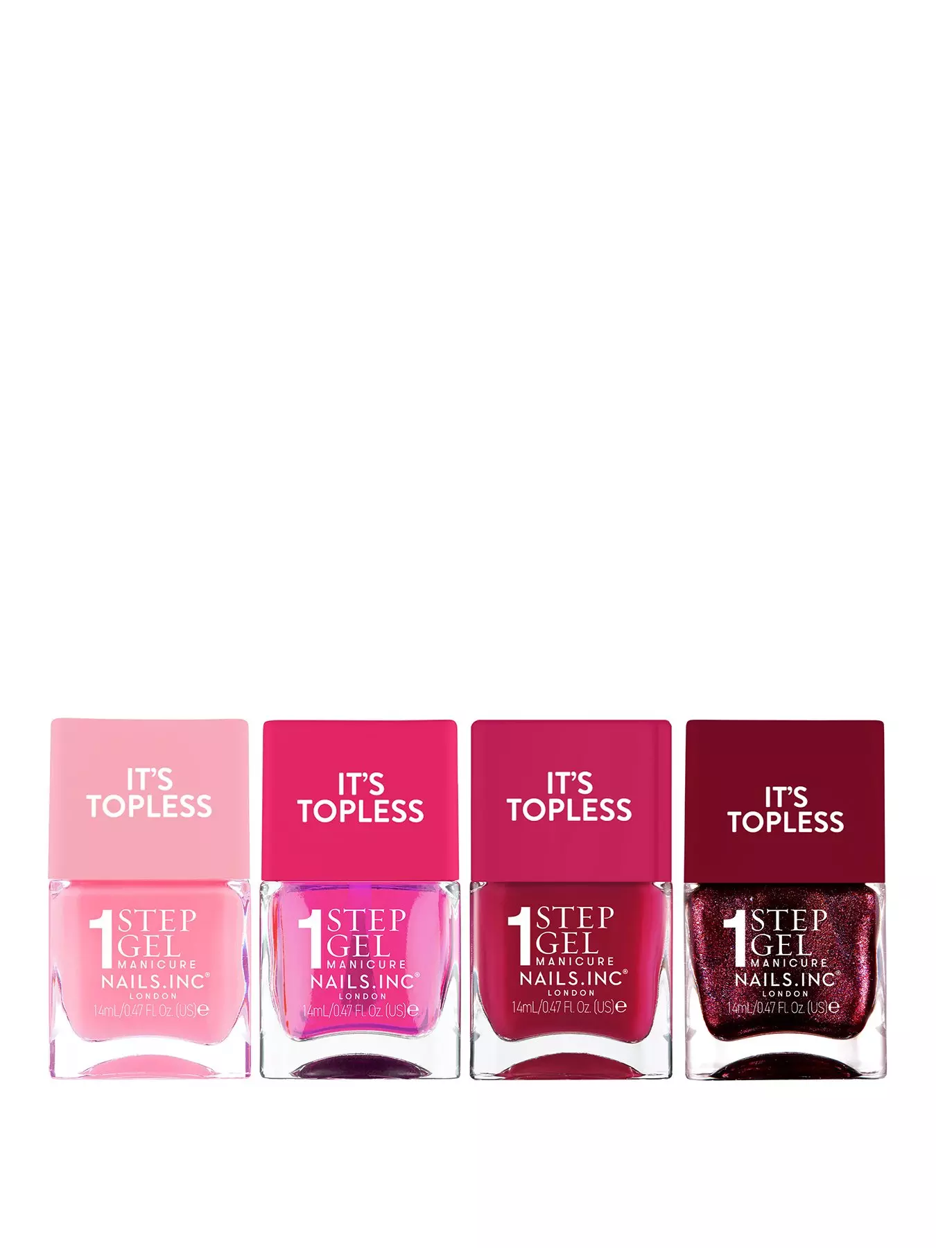 A set of classic cherry-inspired shades in Nails.INC's latest innovation- It's Topless. The 4-in-1 formula with a built in base, treatment, colour and topcoat, combining every stage of your nail routine into just one bottle. Formulated with bio-peptides and glass particles for a glossy chip-resistant at-home gel-like polish finish for up to 6 days of wear. It's your 1-step shortcut to nailing the perfect mani.Shades: