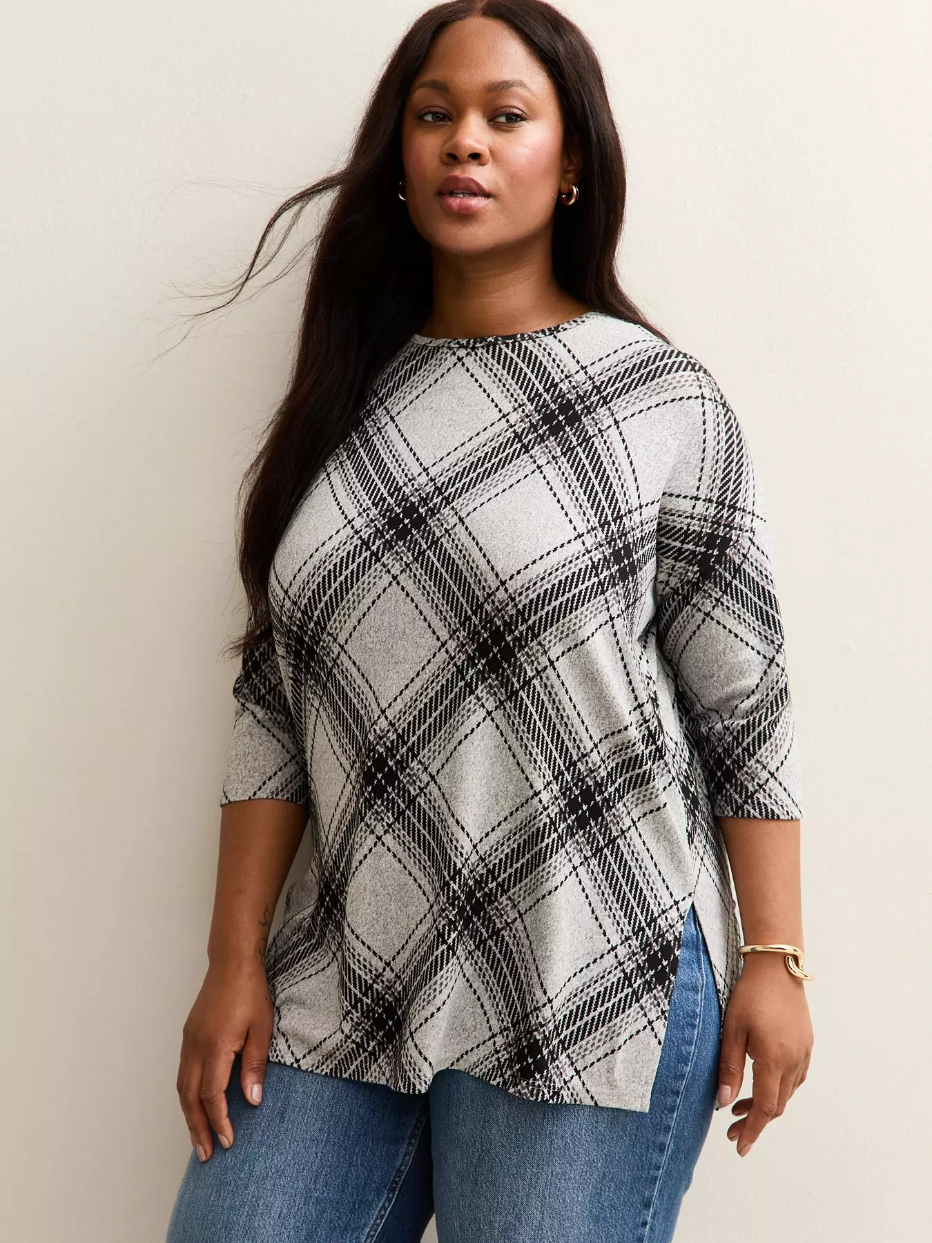 New LookCurves Black Soft Touch Checked Slit Hem Top