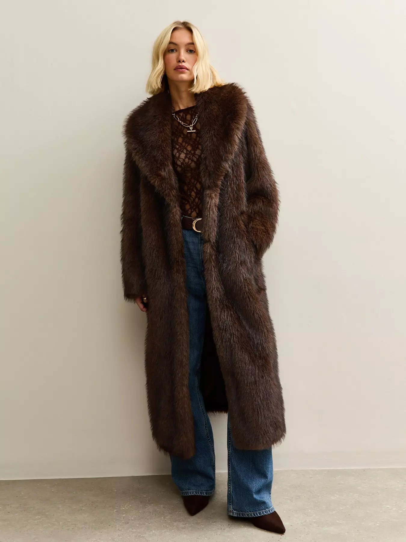 New LookDark Brown Faux Fur Longline Coat