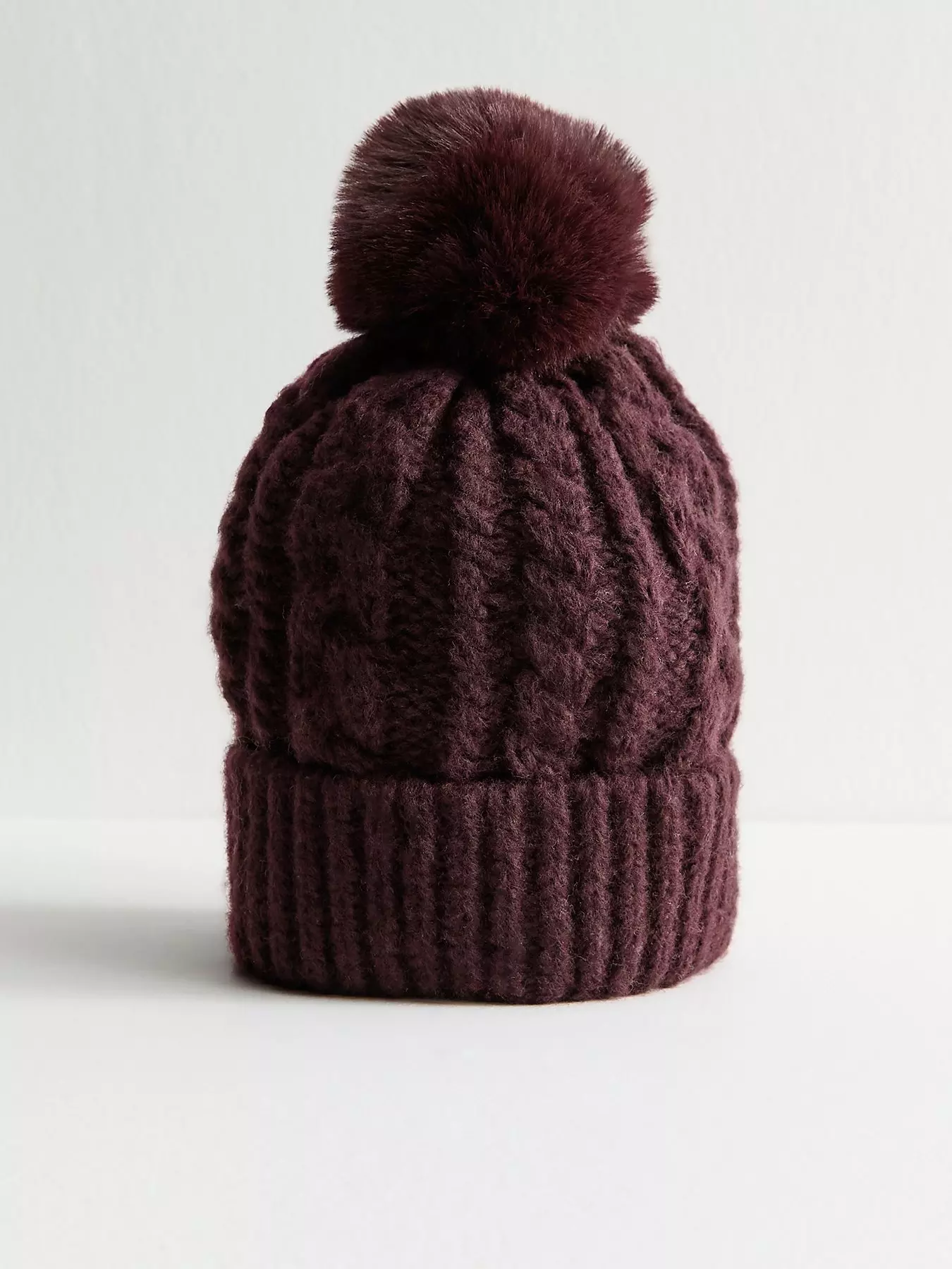 New LookDark Burgundy Cable Knit Faux Fur Pom Pom Bobble Hat