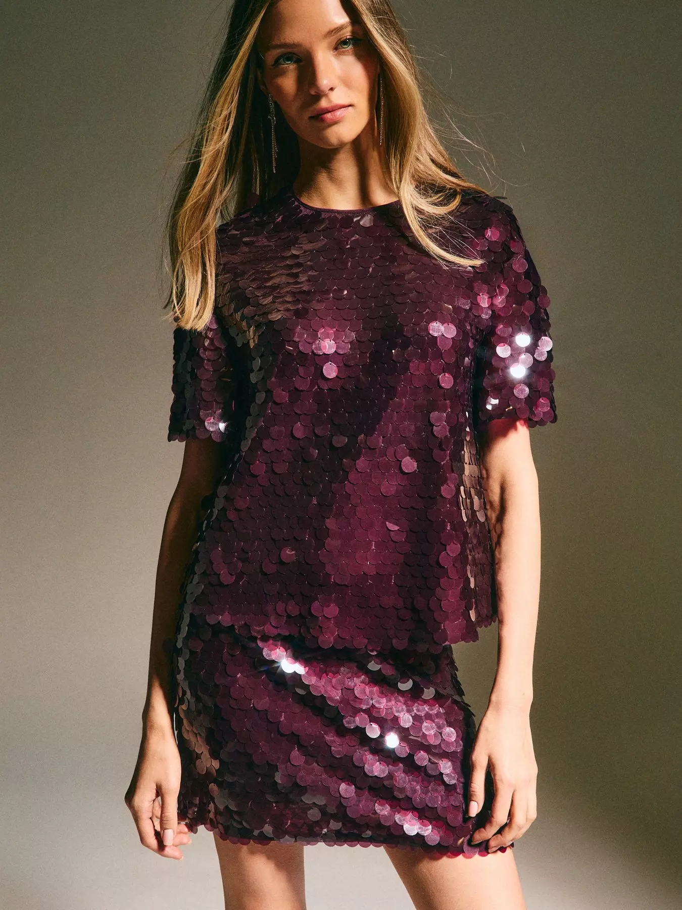 New LookDark Burgundy Sequinned Short Sleeve Top