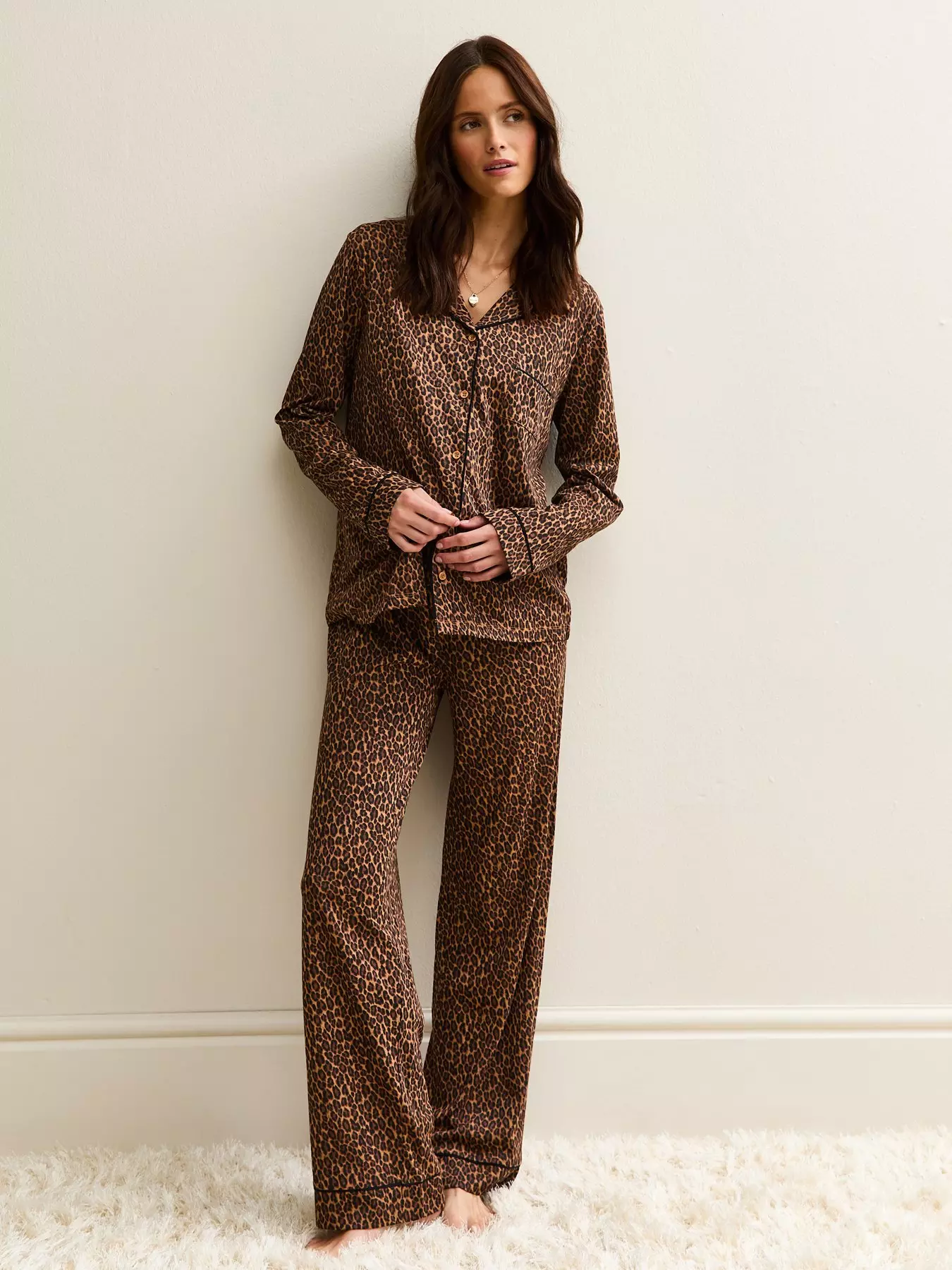 New LookLeopard Print Jersey Revere Collar Pyjama Set - Print