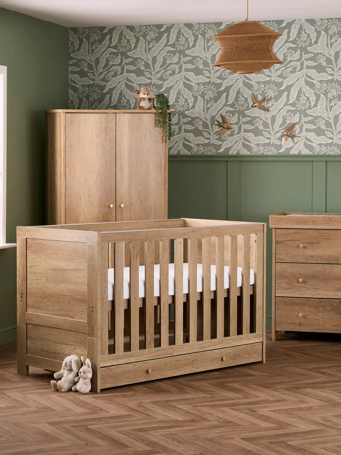 The Nika 3-Piece Nursery Room Set enables you to design a stylish, comfortable nursery tailored to your little one's needs. The Nika range seamlessly fits into your home, featuring a beautifully oak finish and sleek lines for a timeless style that grows with your child.The Nika cot bed is more than just a safe and cosy place for your little one to sleep; It's designed to support your child from birth to toddlerhood. Three-position adjustable mattress base: The highest setting allows for easy lifting of newborns, while lower positions keep them safe as they become more mobile. When your little one is ready, the Nika Cot Bed transitions effortlessly into a toddler bed, offering a comfortable and familiar sleep space until around four years old. Built-in teething rails: Thoughtfully designed to protect delicate first teeth while maintaining the cot's condition.
