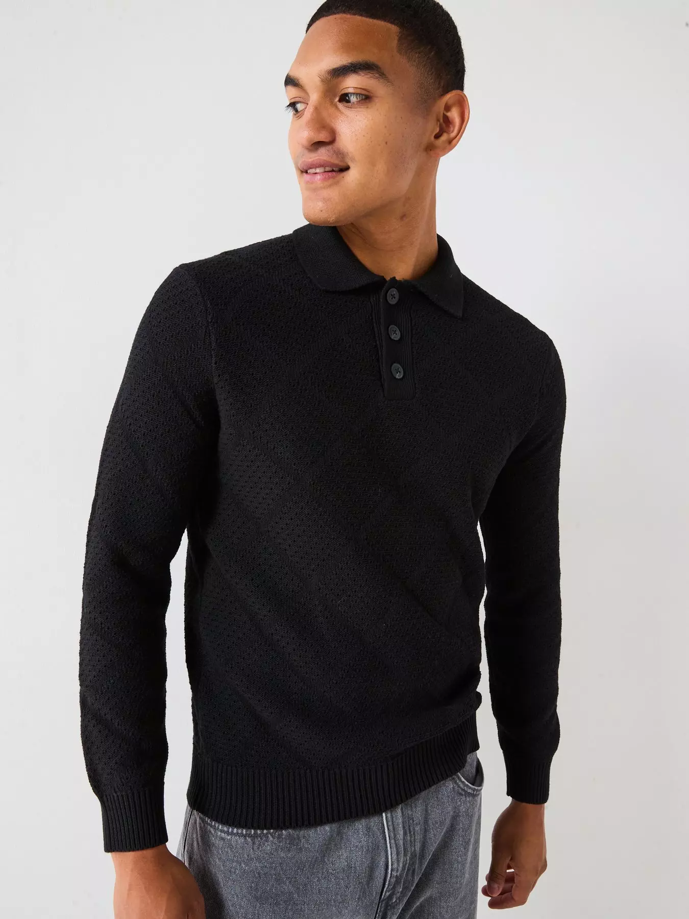 ONLY & SONSMap Long Sleeve Chevron Knitted Polo - Black