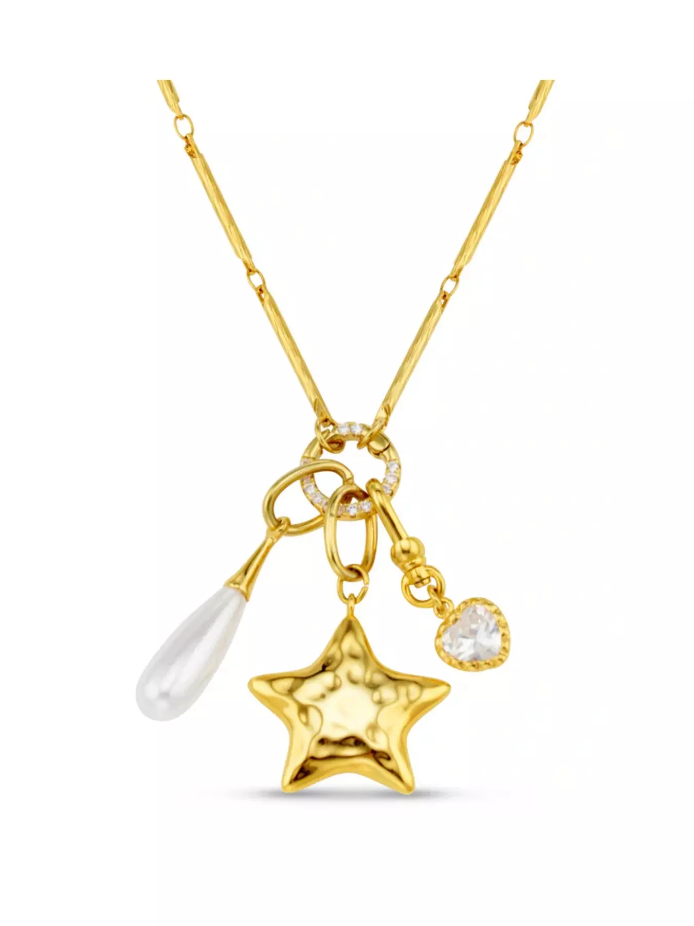 A long chain necklace with an elongated bar-link chain and a trio cluster of charms featuring a teardrop faux pearl, a molten star and a heart cubic zirconia. This jewellery is plated in 18k gold from Orelia.Use the right and left arrows to scroll through the image carouselPage 1 of 322